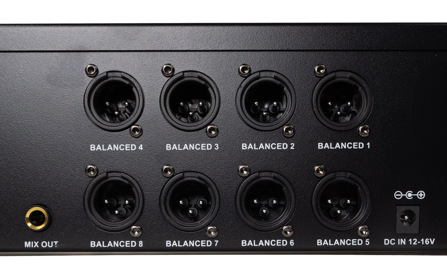 - Mixutgang, hvor alle 8 kanaler kan sendes på ett output, f.eks. til en aktiv høyttaler (6,3mm jack)