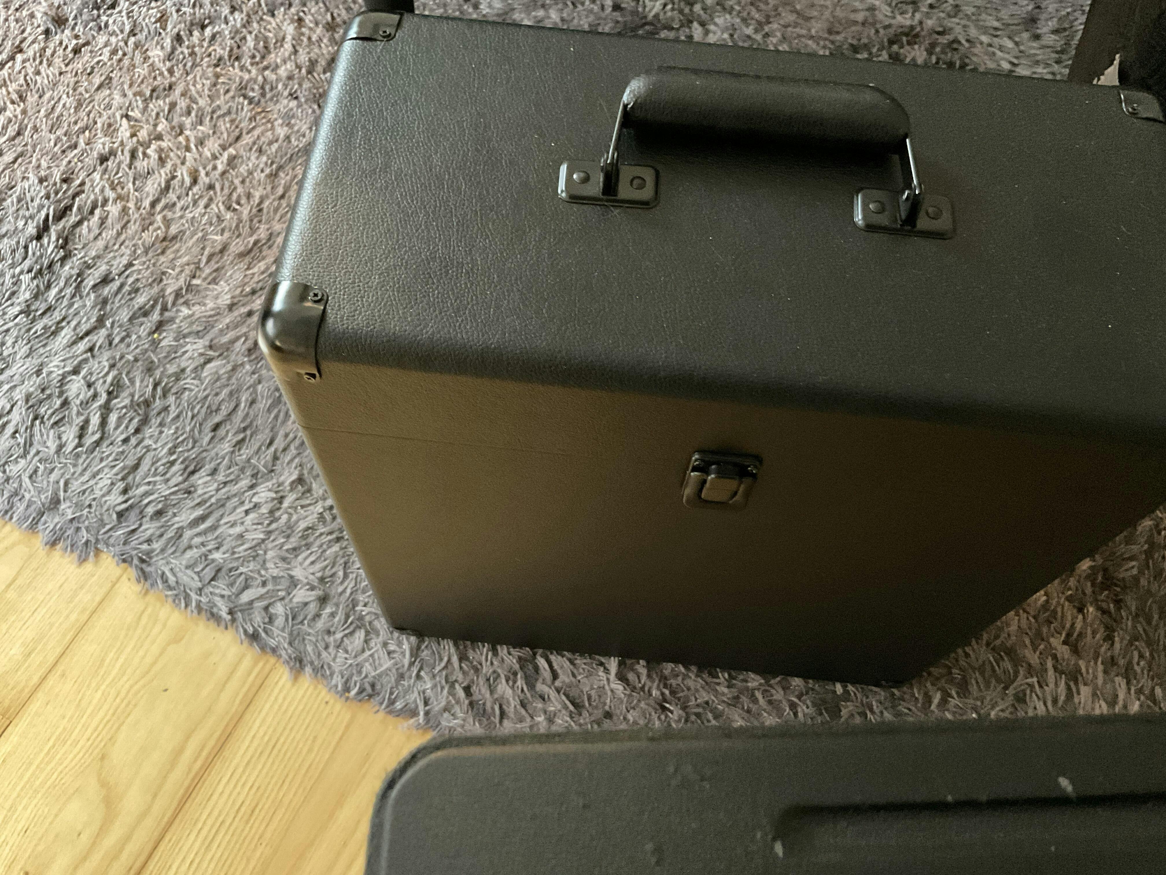 Studio 57 har laget denne oppbevaringsboksen med et smart håndtak i stilig sort skinnlook. På mange måter ser det ut som en liten koffert, hvor det er lett å se for seg som en DJ som er på vei til å jobbe med platene sine.