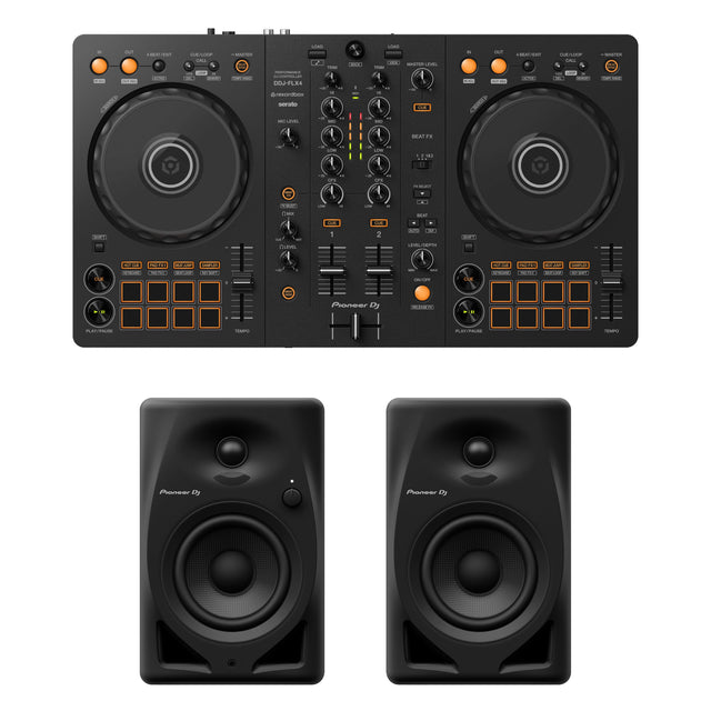 Kule pakker som inneholder Pioneer DJ FLX-4 og DM-40D studiomonitorer
