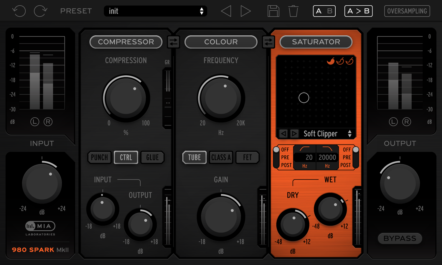 980 Spark MkII er en audio plugin som blander vintage preamp varme med moderne digital presisjon og fleksibilitet. Designet for raske, intuitive arbeidsflyter innen lyddesign og mastering, leverer det en unik metningsopplevelse ved samtidig å justere det spektrale, dynamiske og harmoniske innholdet av lyden din.