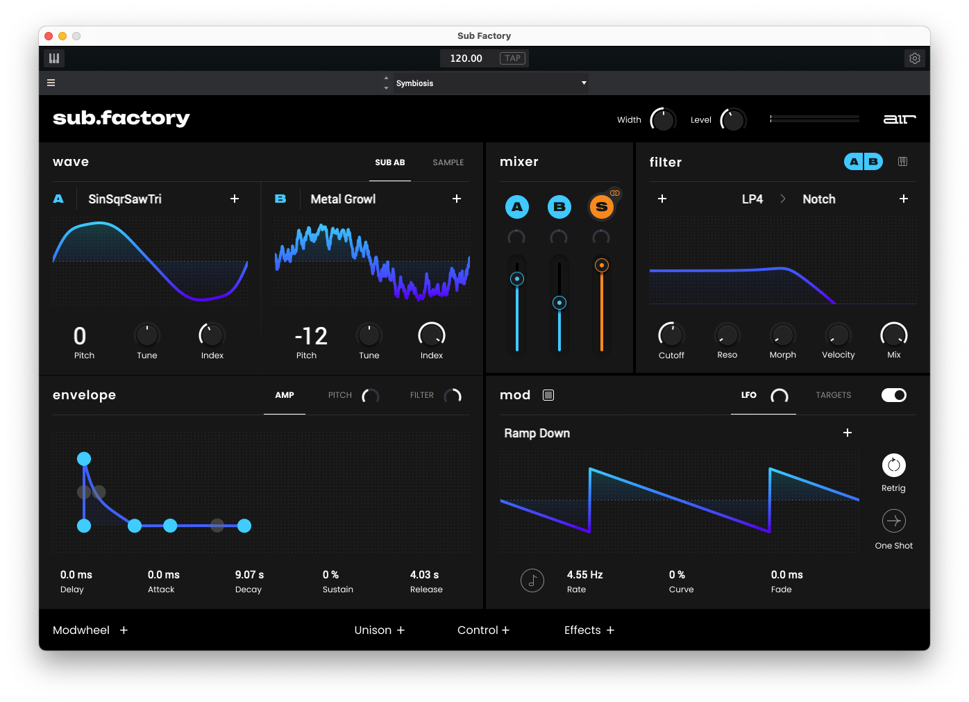 AIR Sub Factory kommer med et betydelig bibliotek av presets designet for å inspirere kreativitet. For de som foretrekker å starte fra bunnen av, tilbyr det et kraftig sett med kontroller. Essensielle effekter som Unison, Spread, Width, Ring Mod, Chorus, Drive, og EQ gir et komplett sett med verktøy for å polere lyden.