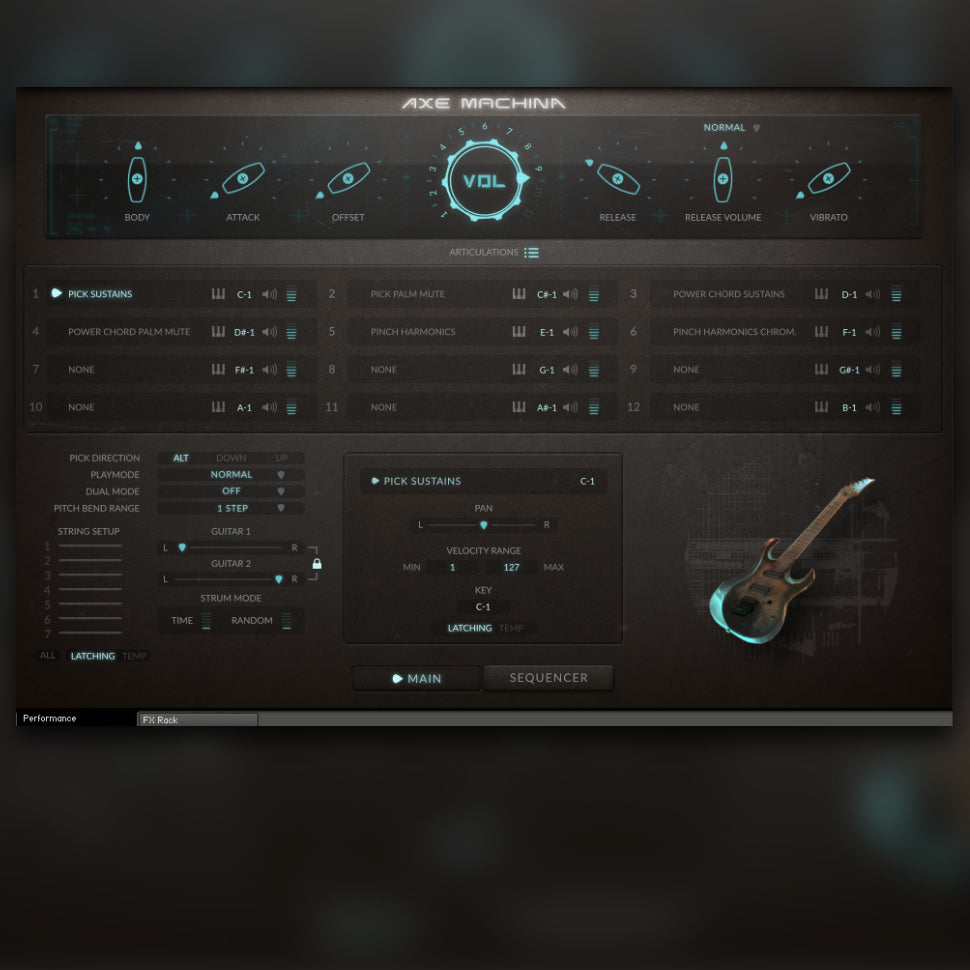 Vi har samplet enkeltnoter og power chord sustains med palm mute-variasjoner. Du vil også finne et utvalg av SFX, som pinch harmonics, mutes, pick scrapes med slow, med og lang, fret noise, chokes, rakes, og slides. Juster inn drømmetonen din ved å sende vårt rene D.I. signal gjennom dine favoritt amp simulator plugins, eller bruk vår tilpassede reamped tone, laget med Neural DSP-programvare. Vårt fleksible GUI gir deg tilgang til sanntids artikulasjonsvalg og ytelsesfunksjoner, key-switch og mapping-alternativer, arpeggiator, auto-strummer, sequencer, og full FX rack, alt pakket inn i et intuitivt og tilpassbart brukergrensesnitt.