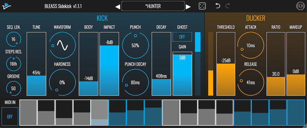 BLEASS Sidekick er et allsidig plugin som kombinerer en kick drum synth, 16-trinns sequencer og ducker for dynamiske sidechain-effekter. Dens analoge kick-motor, inspirert av vintage beatbokser, lager punchy, boomy kicks som kan blandes med inngangssignalet eller rutes til en egen busskanal for videre behandling.