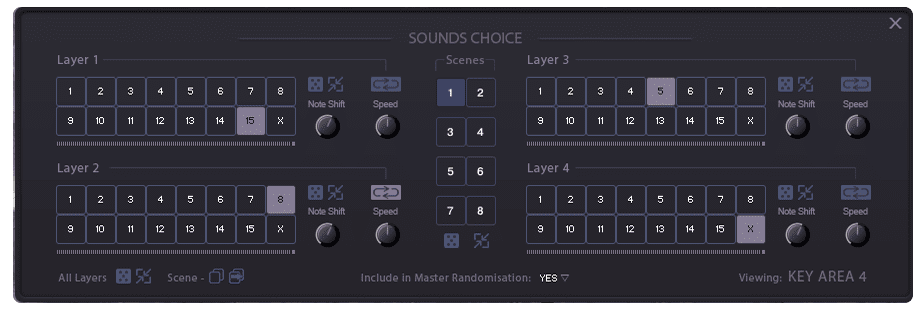 En av de fremragende funksjonene i Blent 9 er Sound Choice-siden. Dette lar deg sette en annen lyd for hver av de fire KEY AREAS per lag. Med 16 samtidige lyder lastet per patch og kartlagt i fire forskjellige soner, har du fleksibiliteten til å lage fire distinkte atmosfærer per patch.