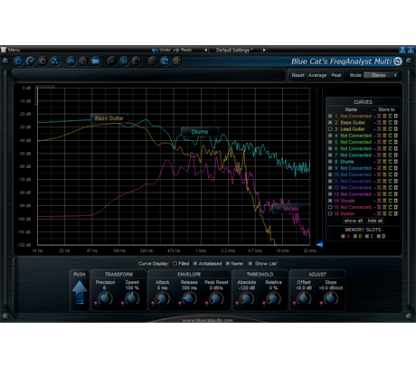 Akkurat som med Blue Cat's FreqAnalyst Pro-plugin, kan frekvensanalysen finjusteres i detaljer, og tre moduser tilbys for hver kanal: øyeblikkelig, topp eller gjennomsnittlig respons av flere lydspor kan vises på samme graf (plugin støtter opptil 16 kurver). Zoomingmuligheter og koordinatvisning lar deg nøyaktig måle egenskapene til spekteret for hvert lydspor. Takket være de avanserte rutemulighetene kan du definere forskjellige innstillinger for hvert spor og dermed tilpasse analysen for hvert lydsignal du ønsker å analysere. Vår veiledning for flere spor viser deg hvor enkelt flere spor spektralanalyse kan være.