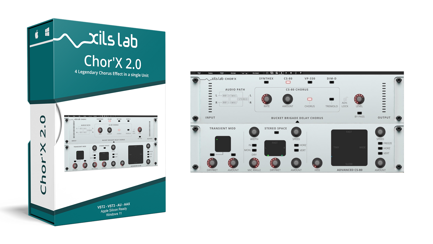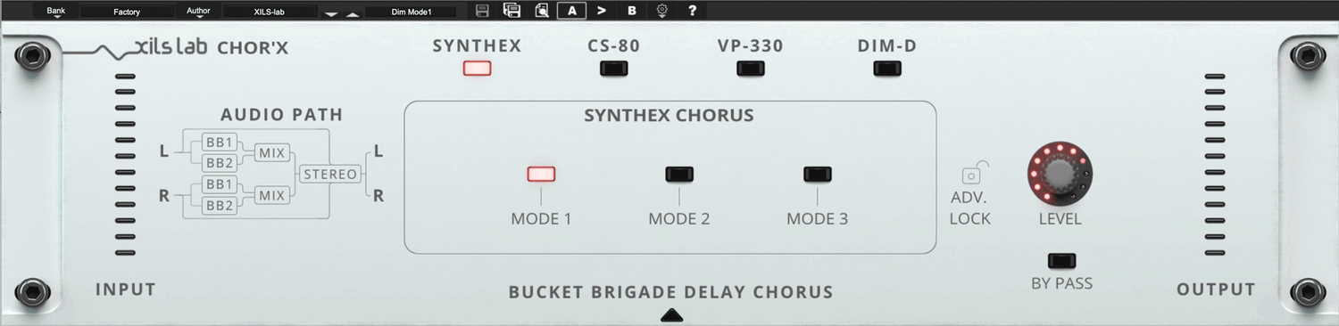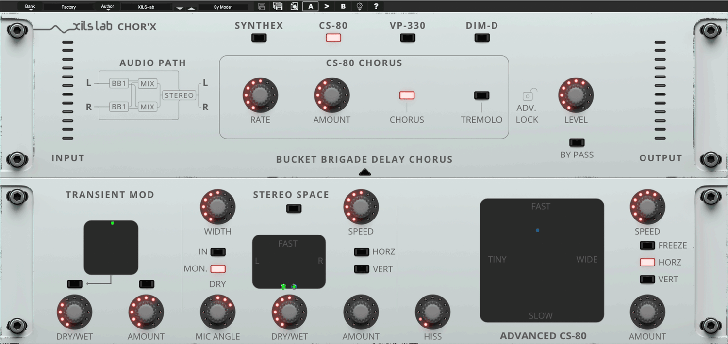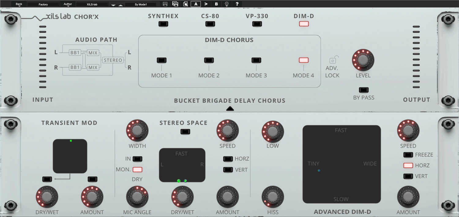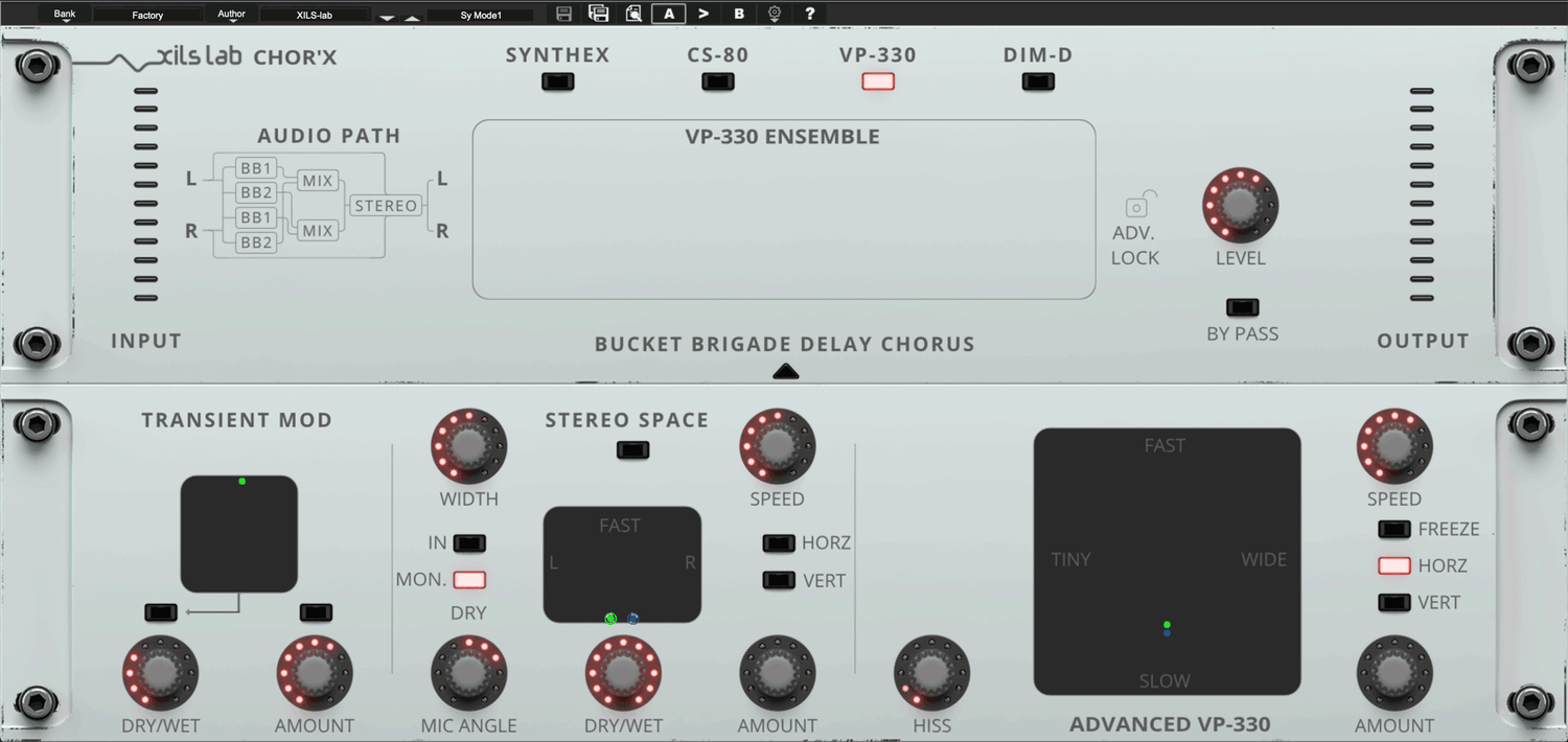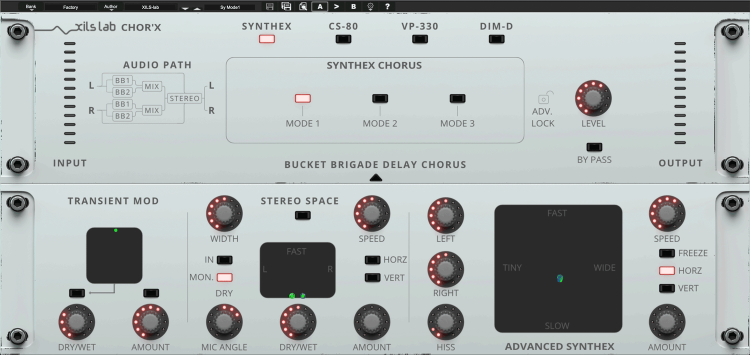 XILS-Lab har gjort store anstrengelser for å skape autentiske chorus-effekter. Etter å ha studert mange vintage chorus-enheter og avdekket hva som gjorde hver enkelt unik, modellerte de deretter fire chorus-moduser (Synthex, CS-80, Dim-D og V+ 330). Chor'X emulerer noen av de mest kjente arketypiske strukturene som finnes i disse legendariske enhetene: 4 BB Delays, 2 BB Delays og 2 BB Delays med fasejusteringer, med eller uten en intern kompraktor. Slipp kreativiteten løs og gå amok ved å kombinere disse forskjellige chorus-effektene sammen!