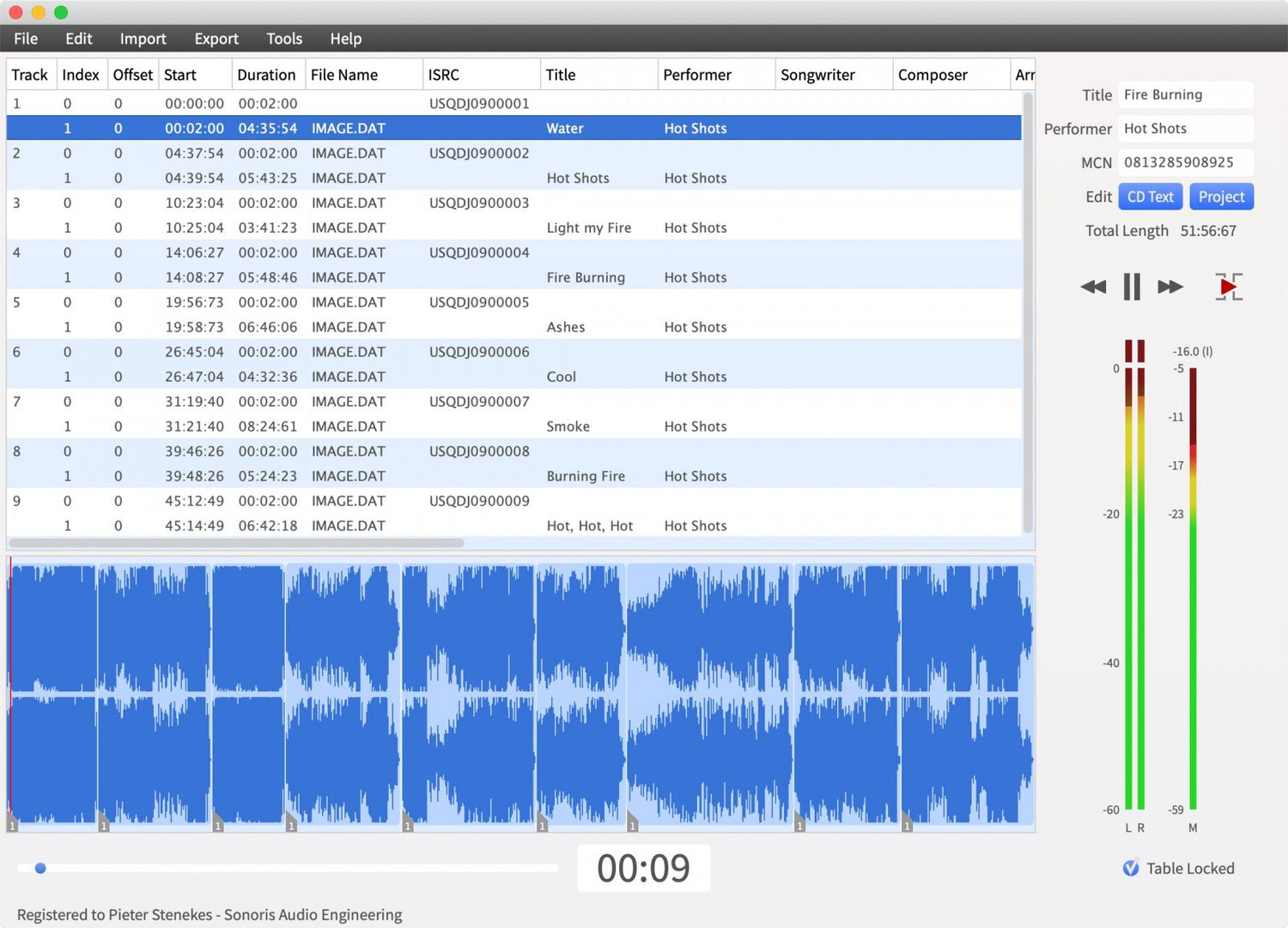 Sonoris DDP Creator er en frittstående, plattformuavhengig CD-autoriseringsapplikasjon som er kompatibel med nesten all DAW-programvare på markedet. DDP Creator lar deg sette sammen profesjonelle RedBook-kompatible lyd-CD-er og støtter import og eksport av DDP 2.00-bilder og Cue Sheet (cue) filer. Den gjør det også mulig å brenne og rippe lyd-CD-er og sende bilder via FTP.