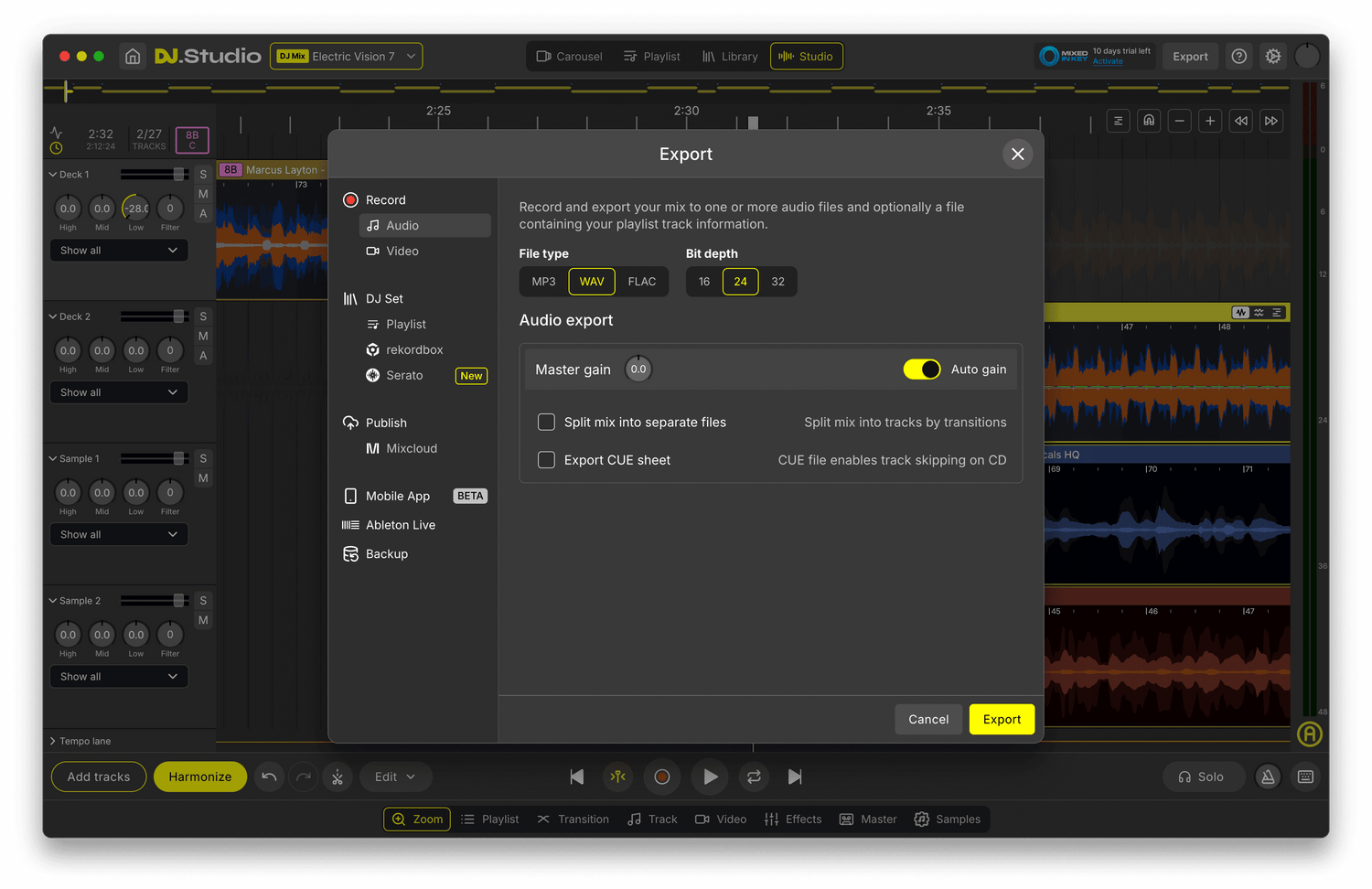 - Eksporter: MP3 og WAV-filer, DJ-sett (M3U), Mixcloud, Ableton live