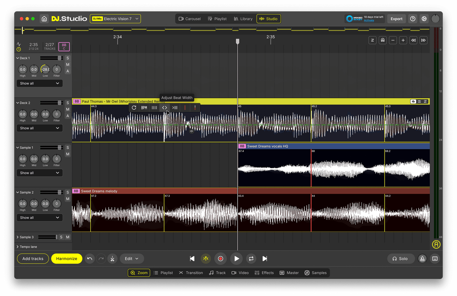 - Standard og tilpassede overgangspresets, med kurver for volum, EQ, og effekter.