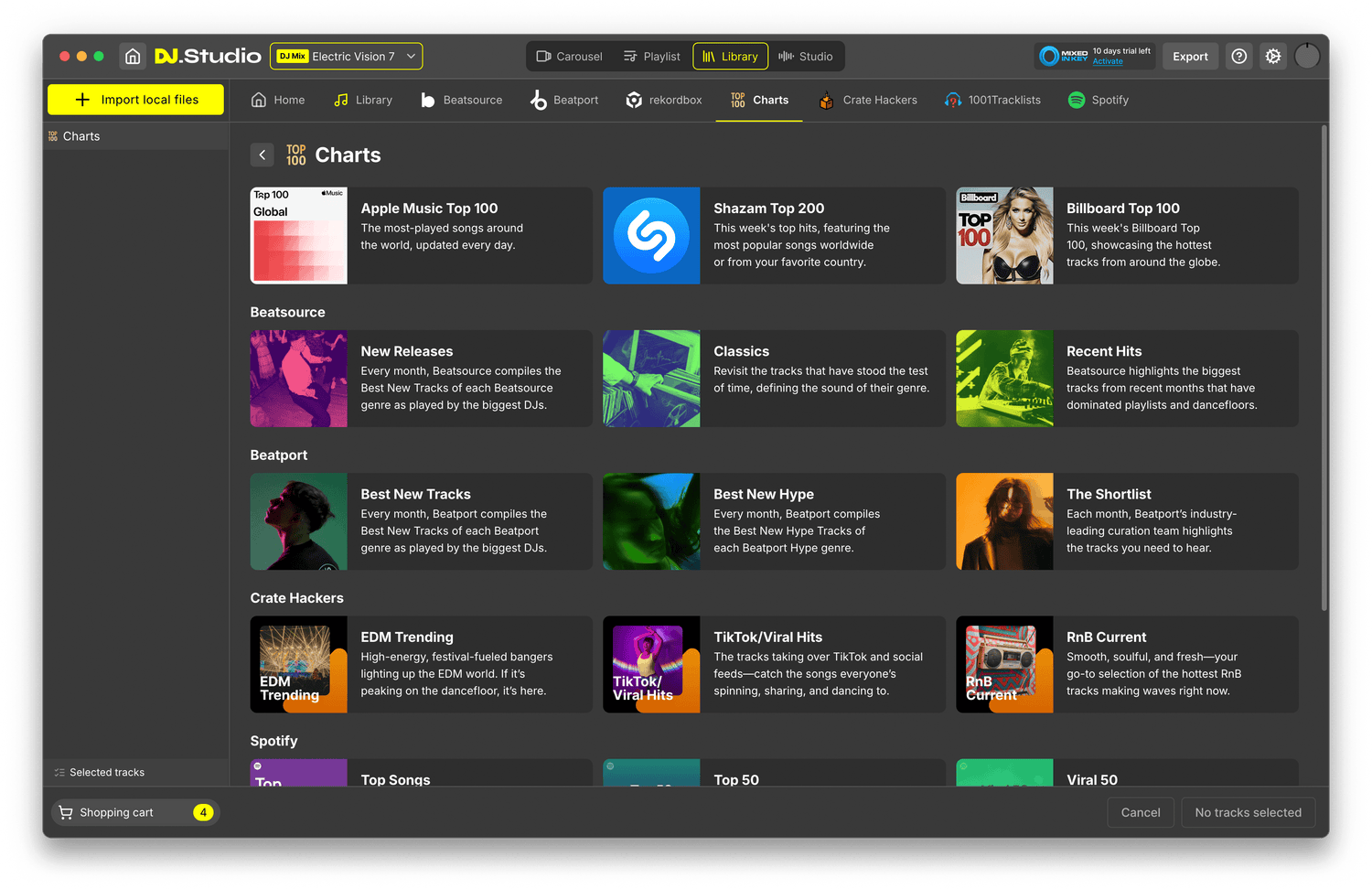 - Importer musikk fra lokale biblioteker inkludert iTunes, rekordbox, Serato, VirtualDJ, Mixed In Key, Engine DJ, Traktor, eller bla gjennom lokale filer (MP3, WAV, AIFF, FLAC, og mer).