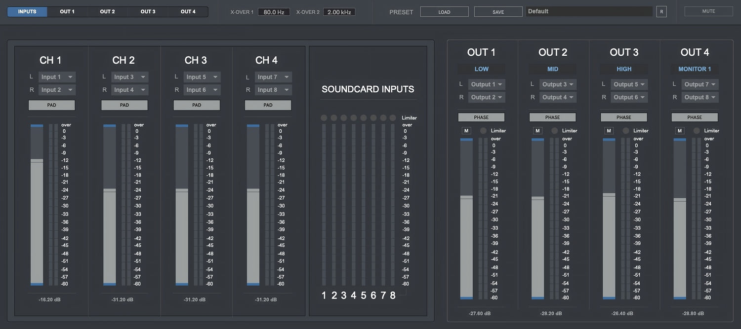 - Utganger: Opptil 4 stereo lydutgangskanaler. Hver utgangskanal inkluderer 5-bånds parametrisk EQ, LPF, HPF, forsinkelser, 4 vst/au plugin-seksjoner & en innebygd brickwall limiter for å unngå klipping og forvrengning.