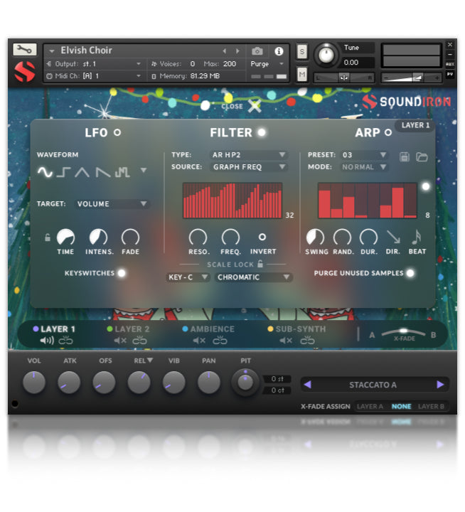 - Flexible and intuitive multi-layer user interface controls, with LFO, filter, glide, and arpeggiator