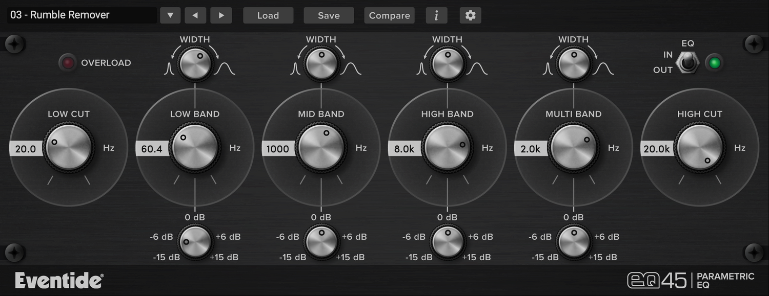 EQ45 er en lettvekts, fire-bånds parametrisk equalizer plug-in som lar deg elegant forme konturene av et lydsignal ved å forsterke eller dempe frekvenskomponentene. Basert på kretsmodellen til den analoge Urei 545 parametriske EQ, har plug-in-en høyt- og lavpassfiltre sammen med et elegant og brukervennlig interface. Den klassiske Urei 545 var den ‘go to’ EQ-en for en generasjon av ingeniører, favorisert for sin tone og farge. Den høye oppløsningen og fleksibiliteten til filtrene og det brede antallet parametere som tilbys av brukergrensesnittet, gjør at du kan utføre subtile eller drastiske endringer på lydmateriale uten ubehagelige artefakter.