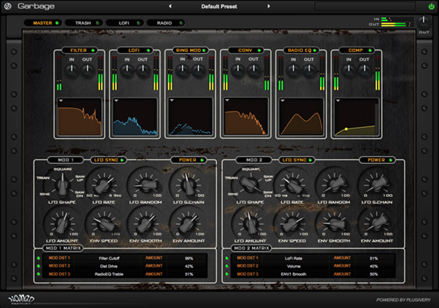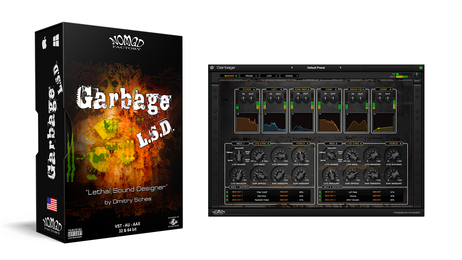 GARBAGE LSD er et sinn-bøyende audio transformasjons plug-in med brukerjusterbar signalbane og dual modulasjonsmatrise. Det gir en serie dødelige moduler for å manipulere, forvrenge, ødelegge og transformere lydene dine med radioaktiv modulasjon, junk EQs, krummende konvolusjoner og skittent filtrering for å nevne noen.