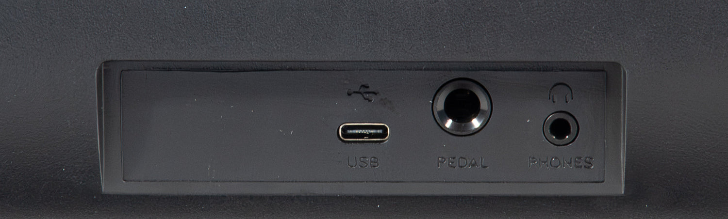 - Tilkobling: USB-C strøm (USB-A kabel medfølger), sustainpedal (6,3 mm), hodetelefonutgang (3,5 mm)