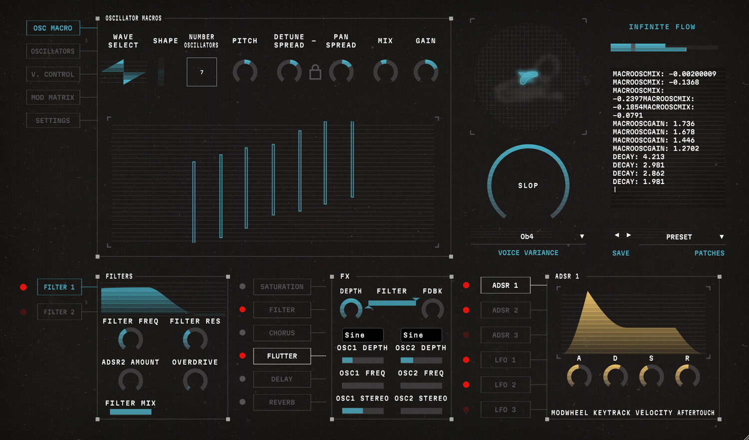 - 8-voice synth with 7 oscillators