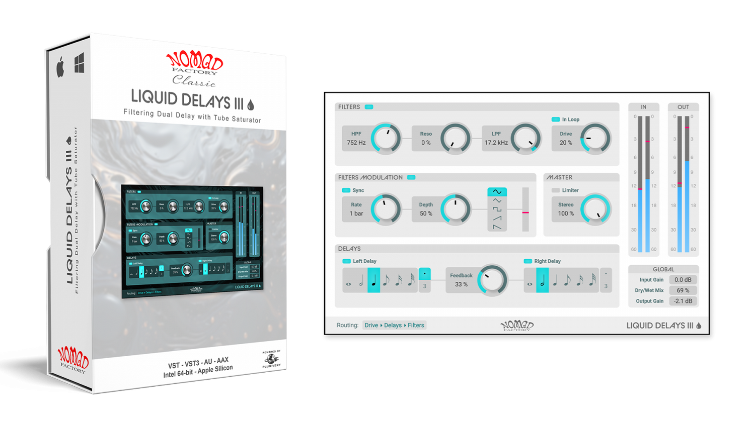 Liquid Delays III gjenoppretter de frodige ekkoene og rytmiske repetisjonene som definerte utallige klassiske innspillinger. Designet for å etterligne varmen fra vintage delay-enheter, tilfører det rik, analog-inspirert atmosfære til sporene dine med enkel kontroll.
