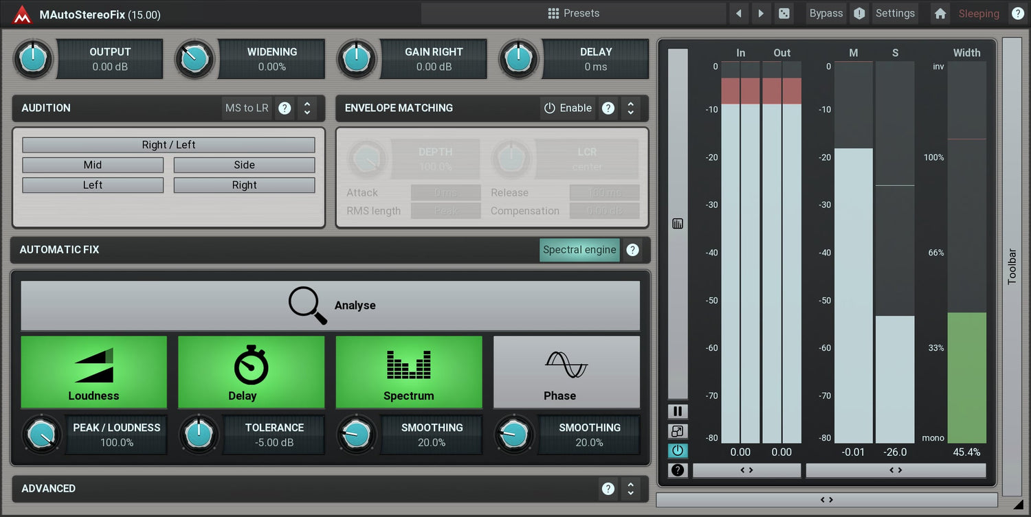 MAutoStereoFix er et magisk verktøy som fikser problemer i stereoinnspillinger, selv om du ikke engang visste at det var noen! Det er designet for stereomikrofoninnspillinger som overheads og rom, men kan også brukes på masterspor.