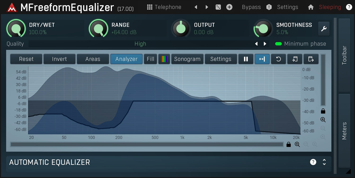 Automatisk equalization (også kalt EQ matching) anvender de tonale egenskapene til ett lydobjekt på et annet. Det kan også brukes til EQ-separasjon, som reduserer spektrale kollisjoner for å gjøre det andre lydobjektet forskjellig fra det første. Det har blitt brukt med suksess på individuelle instrumenter så vel som masterspor. MFreeformEqualizer kan gjøre dette med ekstrem nøyaktighet, og enda bedre, det lar deg eksportere en impulsresponsfil hvis du trenger å bruke den i en ekstern prosessor som implementerer konvolusjon. Veldig praktisk når du behandler gitarer for eksempel.