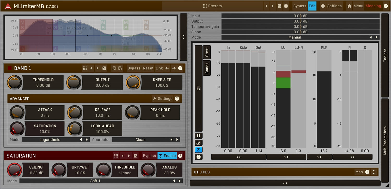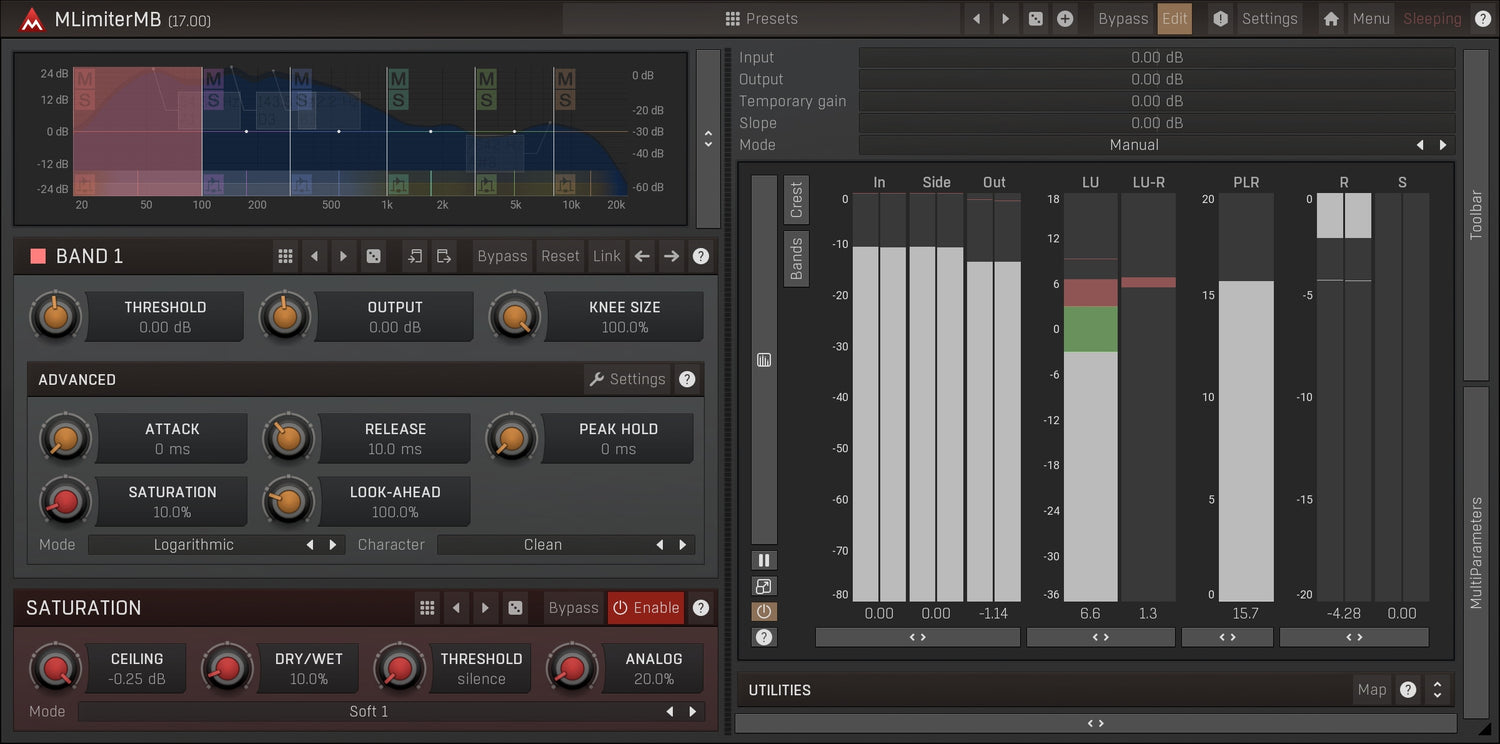 MLimiterMB har vårt fantastiske metningssystem, som kan gi en behagelig analog karakter til musikken din og maksimere lydnivået.