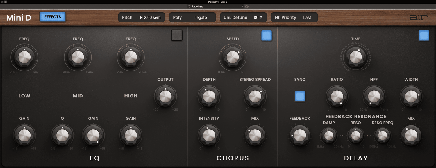 I motsetning til originalen, kommer Mini D med tre effekter allerede på slutten av signalkjeden, perfekt for å legge til farge til lydene dine uten behov for eksternt utstyr eller å bruke ekstra effekter etter plugin. EQ med lav/mid/høy bånd og gain kontroll, stereo chorus-effekter for å utvide lyden med spredning og miks-kontroller, delay med temposynk, høypass, stereobredde, tilbakemelding og mer.