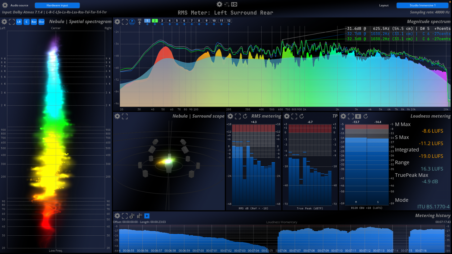 Med MiRA Studio kan du mikse med selvtillit og ha full kontroll i et reaktivt, sanntidsmiljø. MiRA Studio er den første immersive audio analyzer med støtte for opptil 24 kanaler for arbeidsflyter i Dolby® Atmos, Auro3D, NHK 22.2 og andre multikanalformater og høyttaleroppsett, med tilpassbare oppsett og arbeidsområder skreddersydd til dine spesifikke behov.