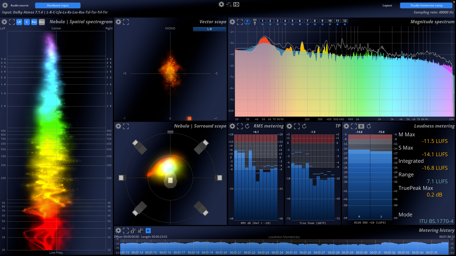 Den unike FLUX:: Nebula visualiserer det romlige lydfeltet i et scope spektrogram for multikanalanalyse i opptil 24 kanaler.