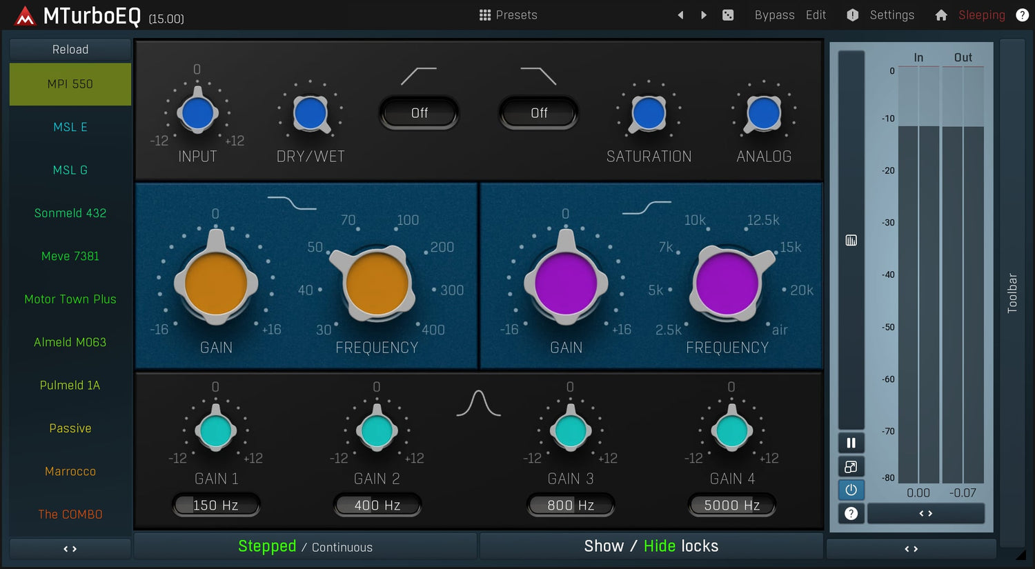 MTurboEQ er en unik vintage-stil equalizer inspirert av de fleste av de kjente klassiske maskinvare. Det er ikke en av dem, det er alle sammen! For rask og enkel equalisering med krystallklare resultater.