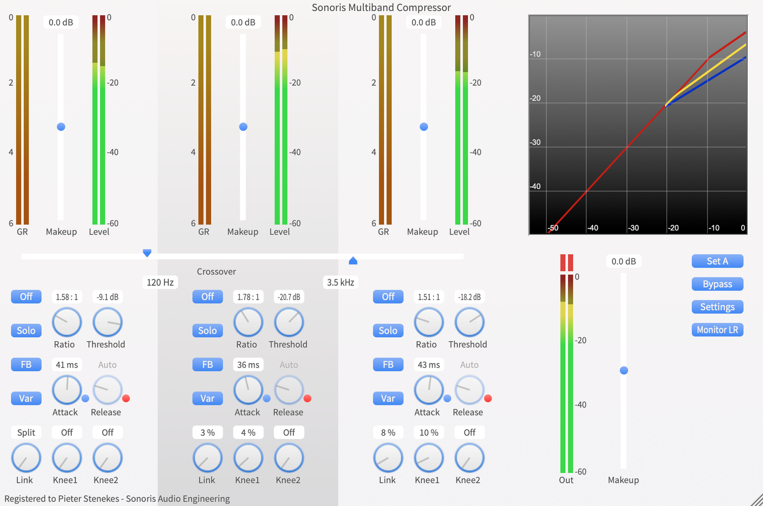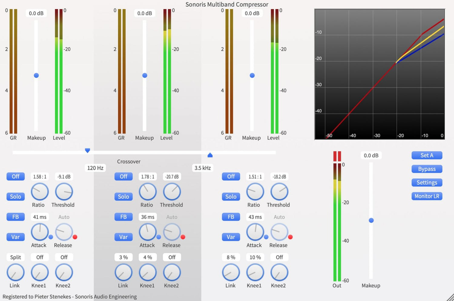 Sonoris Multiband Compressor (=SMBC) er en allsidig tre-bånds kompressor i VST, VST3, AU, AAX og RTAS-format for Windows og Mac. Det er en ultra ren prosessor, egnet for delikat materiale. Den har tre uavhengige frekvensbånd, hver etterfulgt av en kompressor basert på Sonoris Mastering Compressor. De tre båndene er laget med nøye utformede Linkwitz-Riley delefiltre for å unngå faseutskjæringsproblemer, samtidig som de har en veldig naturlig, analog-lignende kvalitet. Etter design blander de seg tilbake flatt. I motsetning til lineære fasefiltre introduserer de ikke ringing artefakter og er mer effektive i bruk.
