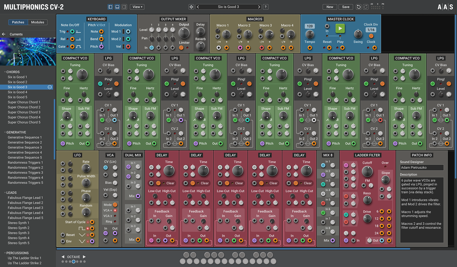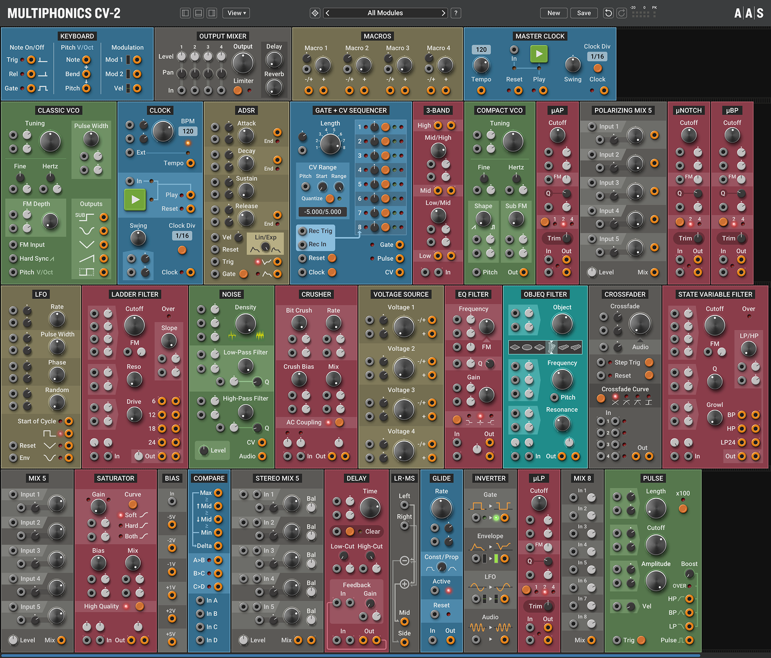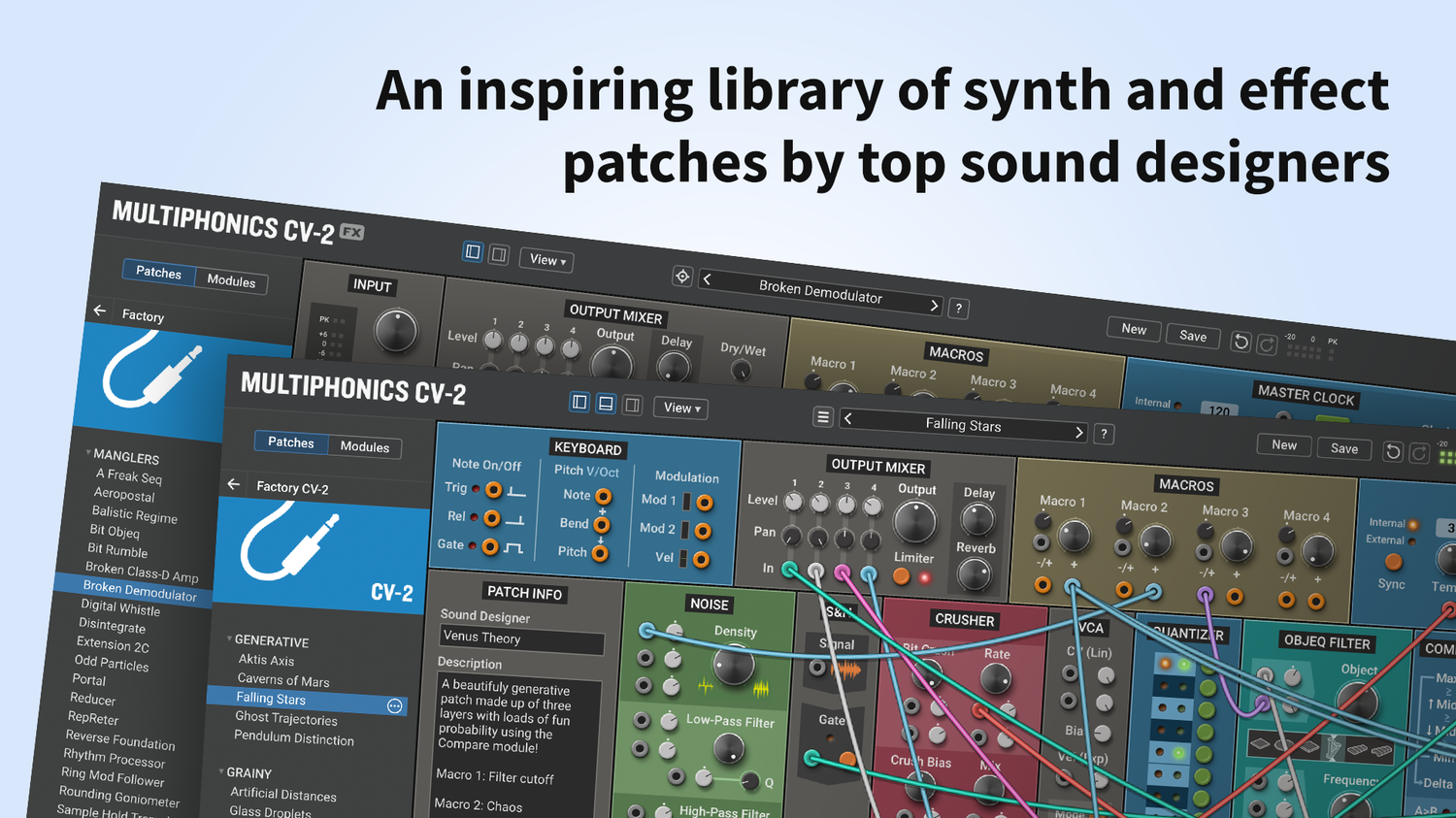 Multiphonics CV-2 er en allsidig modulær plattform for å sette sammen og spille patches. Med et enkelt og oversiktlig interface er Multiphonics et raskt og effektivt verktøy for musikere og lyddesignere. Det er også et flott læringsmiljø for nybegynnere. Kjernen i Multiphonics er et omfattende bibliotek av moduler, fra det grunnleggende til unike og sofistikerte originaler, samt et stort og inspirerende bibliotek av patches laget av topp lyddesignere.