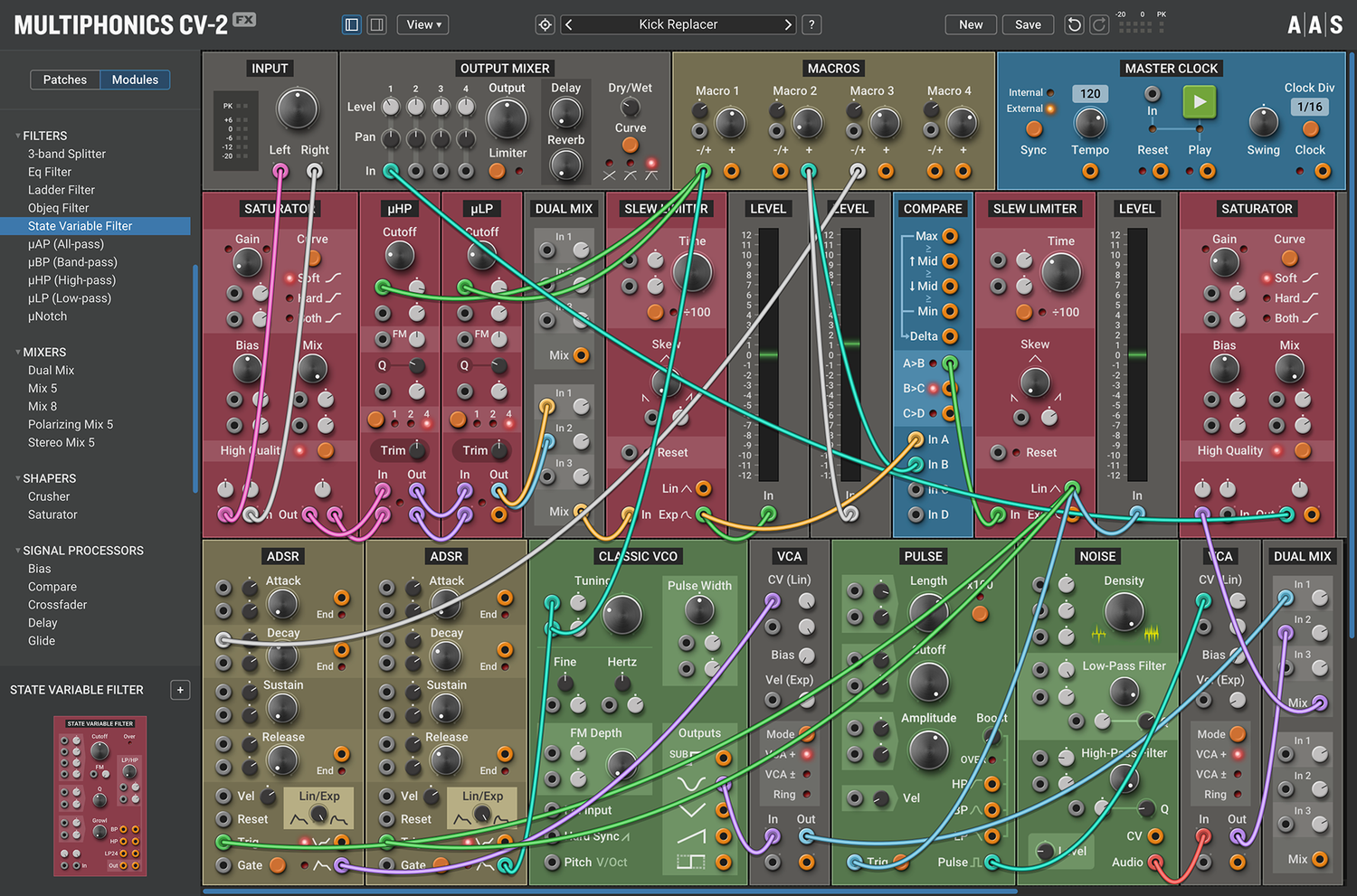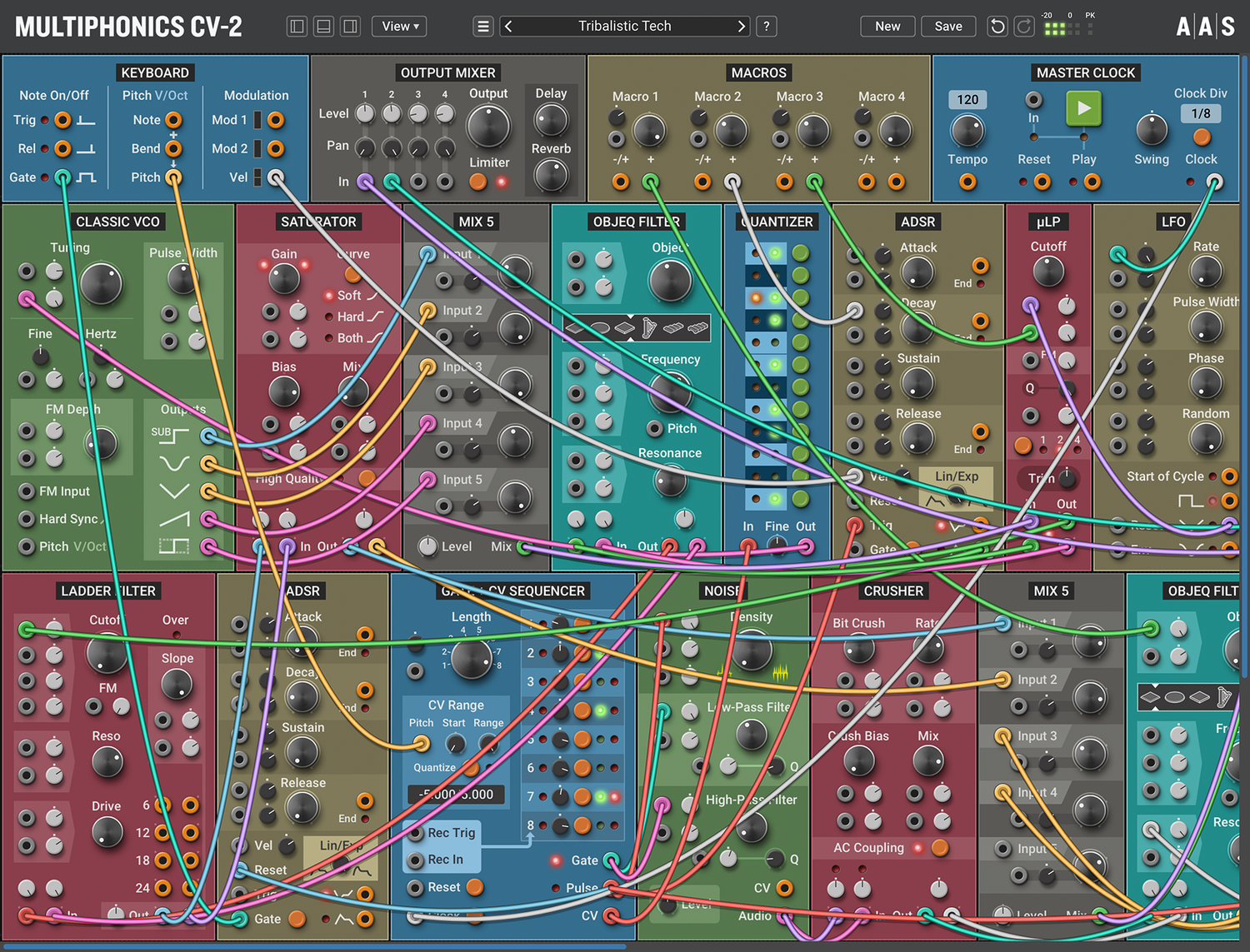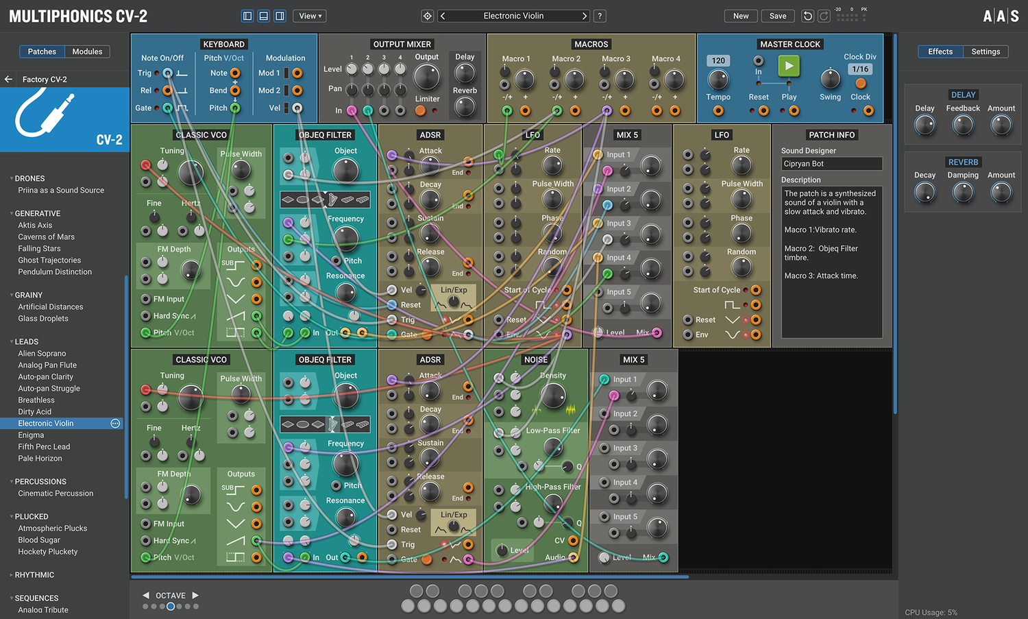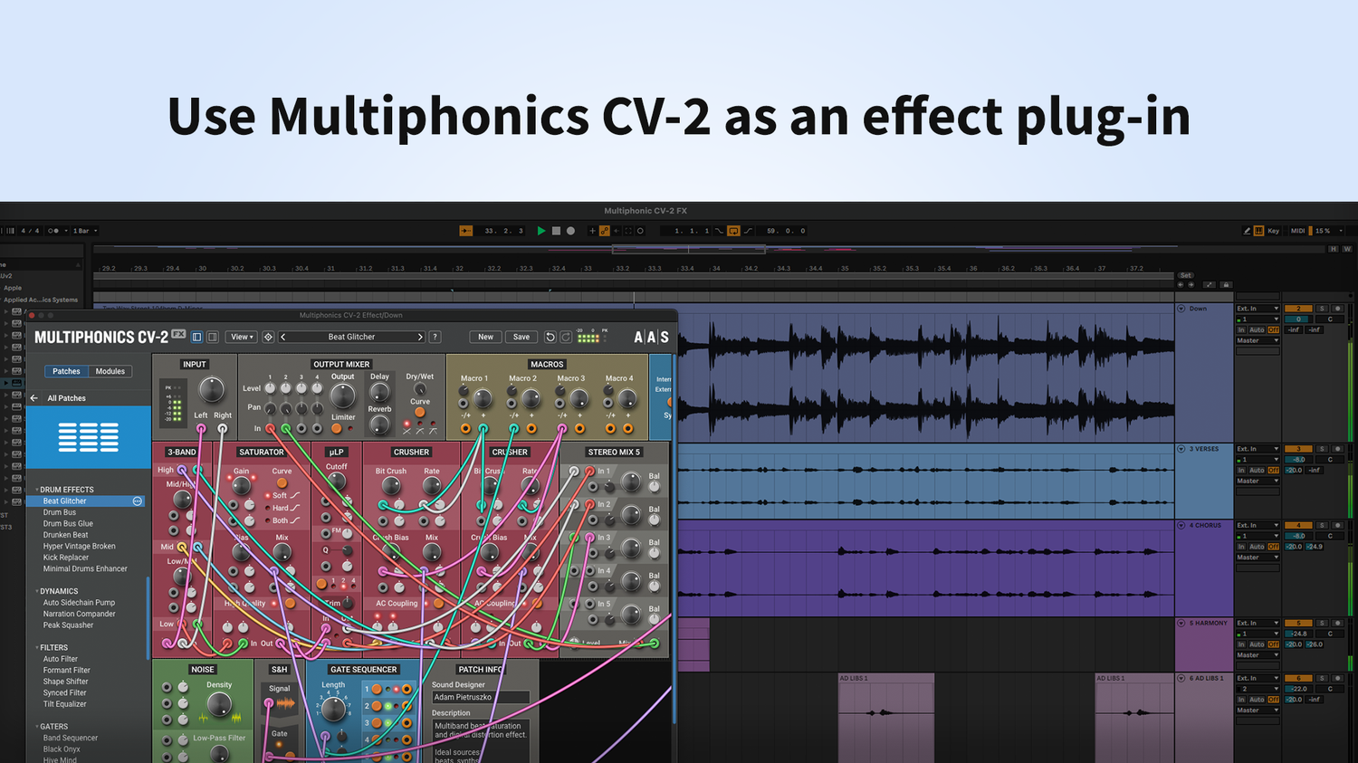 Multiphonics CV-2 er en allsidig modulær plattform for å sette sammen og spille patches. Med et enkelt og oversiktlig interface er Multiphonics et raskt og effektivt verktøy for musikere og lyddesignere. Det er også et flott læringsmiljø for nybegynnere. Kjernen i Multiphonics er et omfattende bibliotek av moduler, fra det grunnleggende til unike og sofistikerte originaler, samt et stort og inspirerende bibliotek av patches laget av topp lyddesignere.