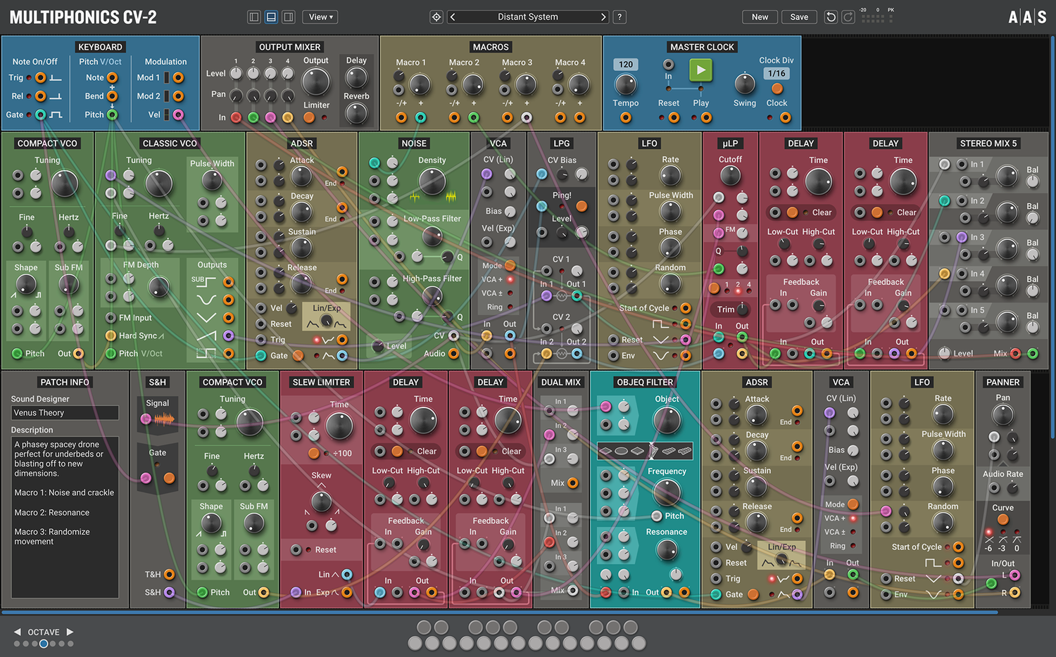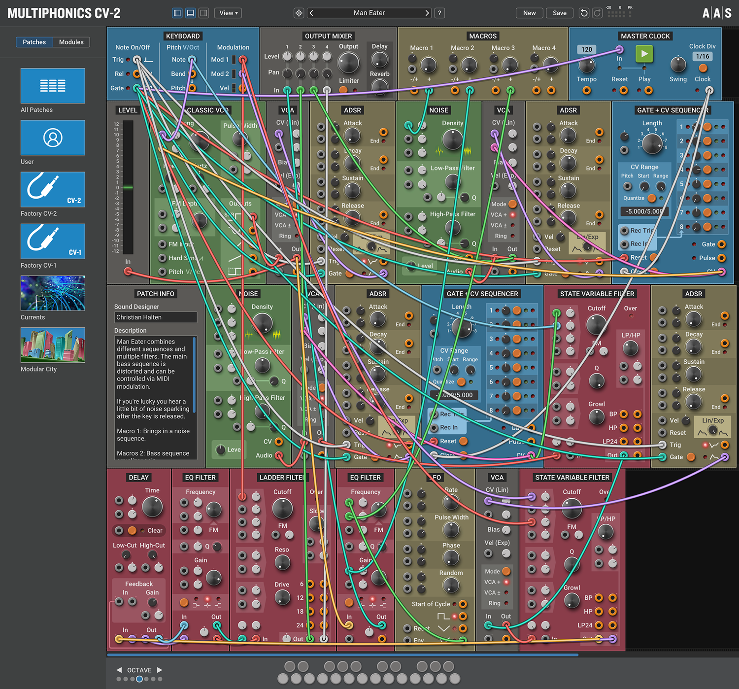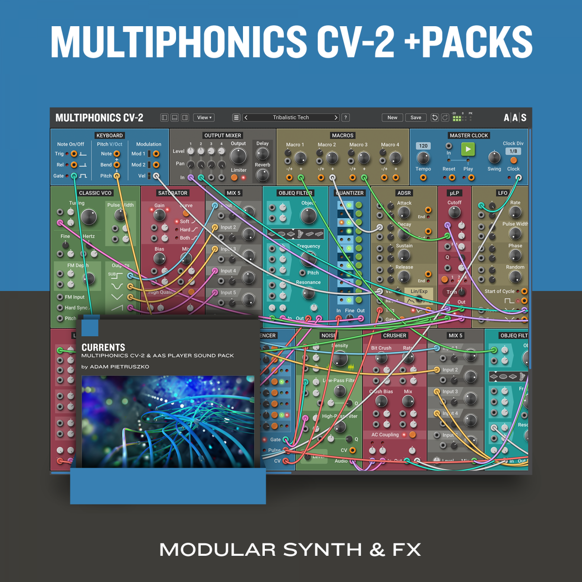 Multiphonics CV-2 er en allsidig modulær plattform for å sette sammen og spille av patches. Med et enkelt og oversiktlig interface er Multiphonics et raskt og effektivt verktøy for opprettelse for musikere og lyddesignere. Det er også et flott læringsmiljø for nybegynnere. Kjernen i Multiphonics er et omfattende bibliotek av moduler, fra det grunnleggende til unike og sofistikerte originaler, samt et stort og inspirerende bibliotek av patches laget av topp lyddesignere.