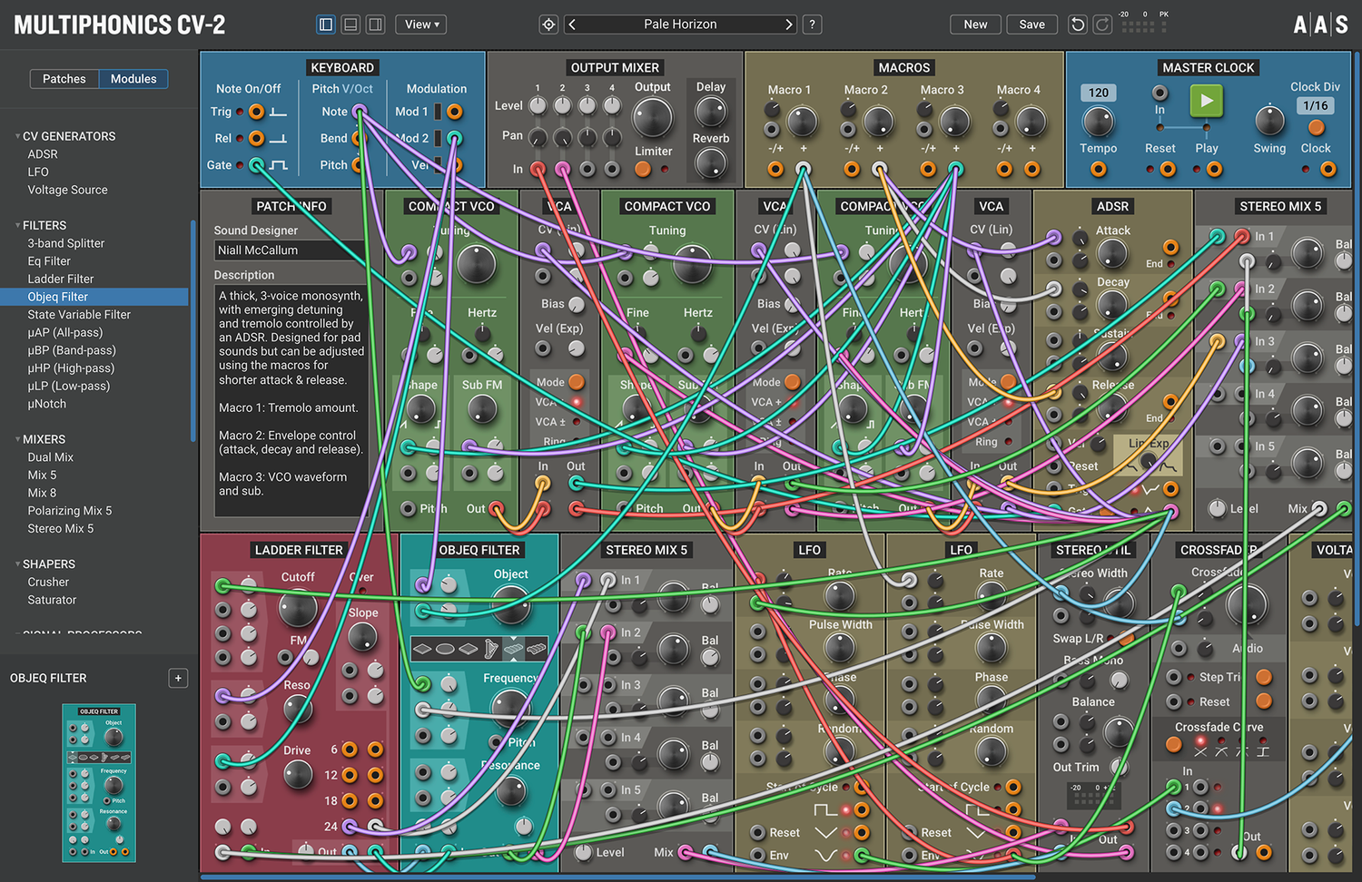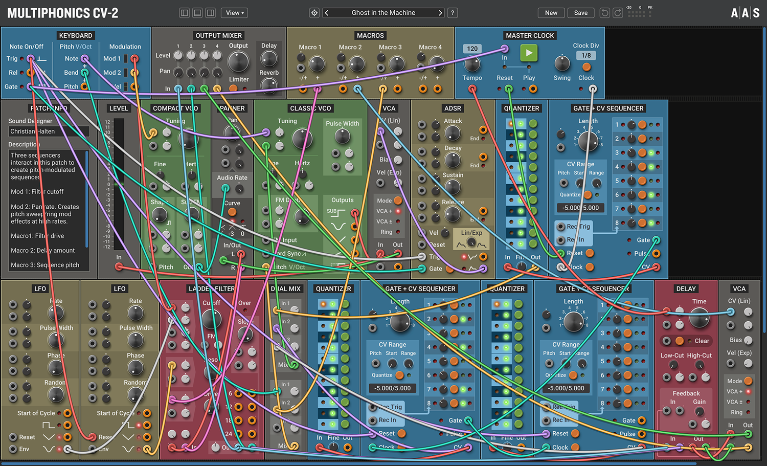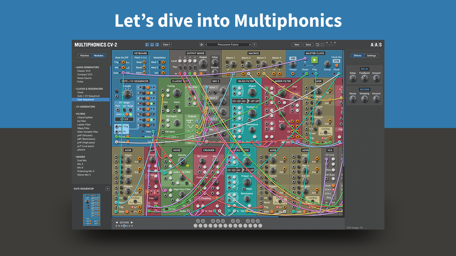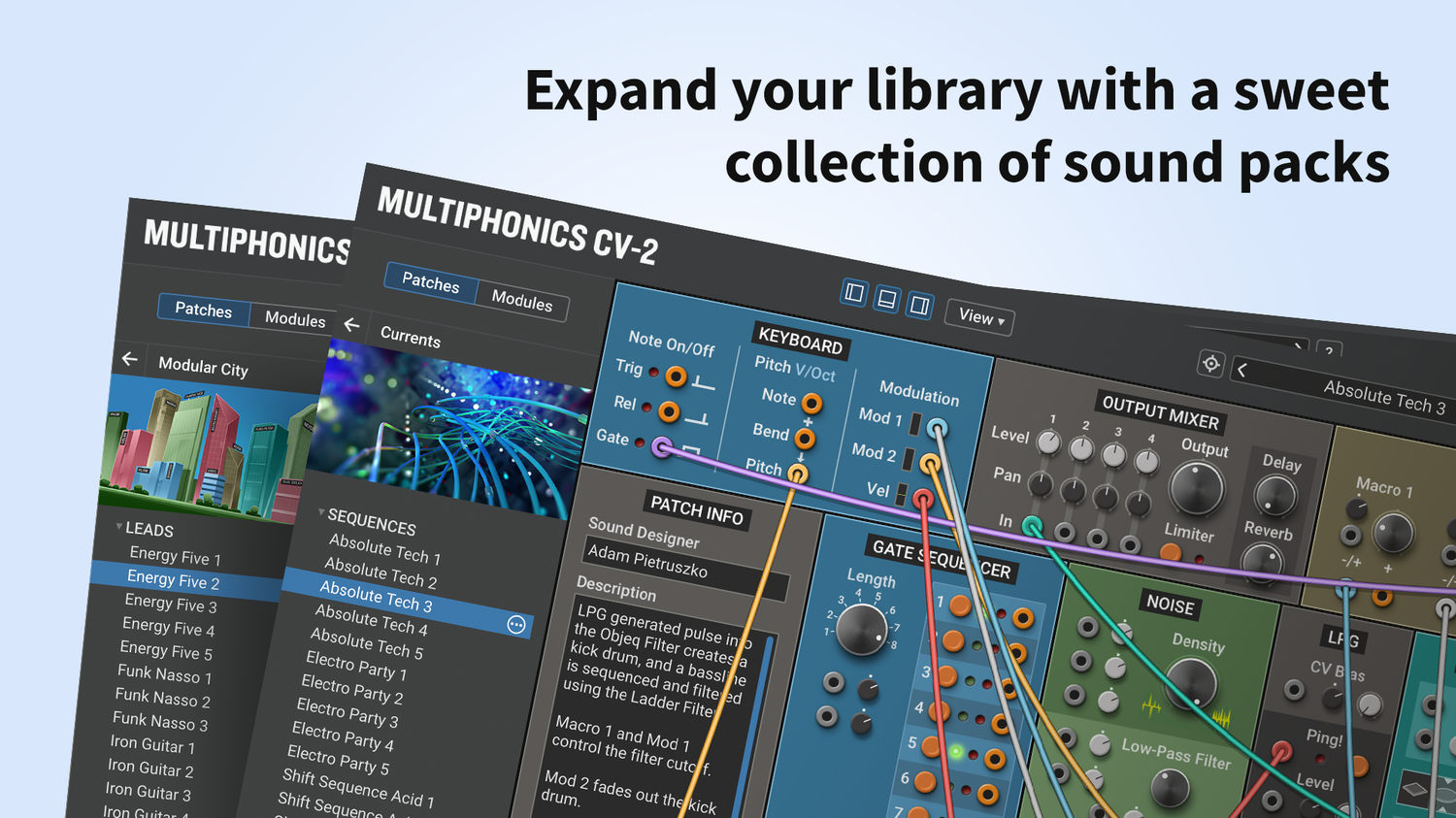 Multiphonics CV-2 er en allsidig modulær plattform for å sette sammen og spille av patches. Med et enkelt og oversiktlig interface er Multiphonics et raskt og effektivt verktøy for opprettelse for musikere og lyddesignere. Det er også et flott læringsmiljø for nybegynnere. Kjernen i Multiphonics er et omfattende bibliotek av moduler, fra det grunnleggende til unike og sofistikerte originaler, samt et stort og inspirerende bibliotek av patches laget av topp lyddesignere.