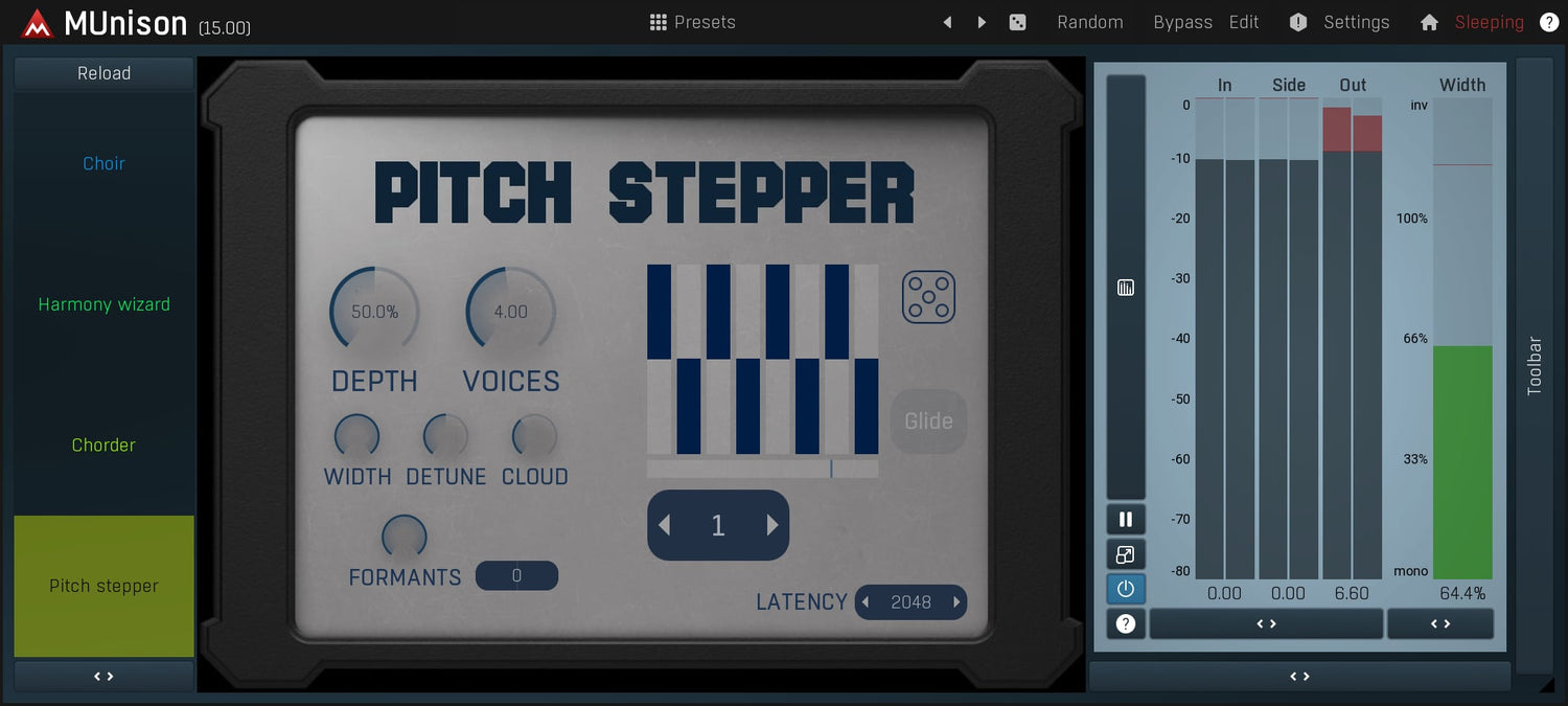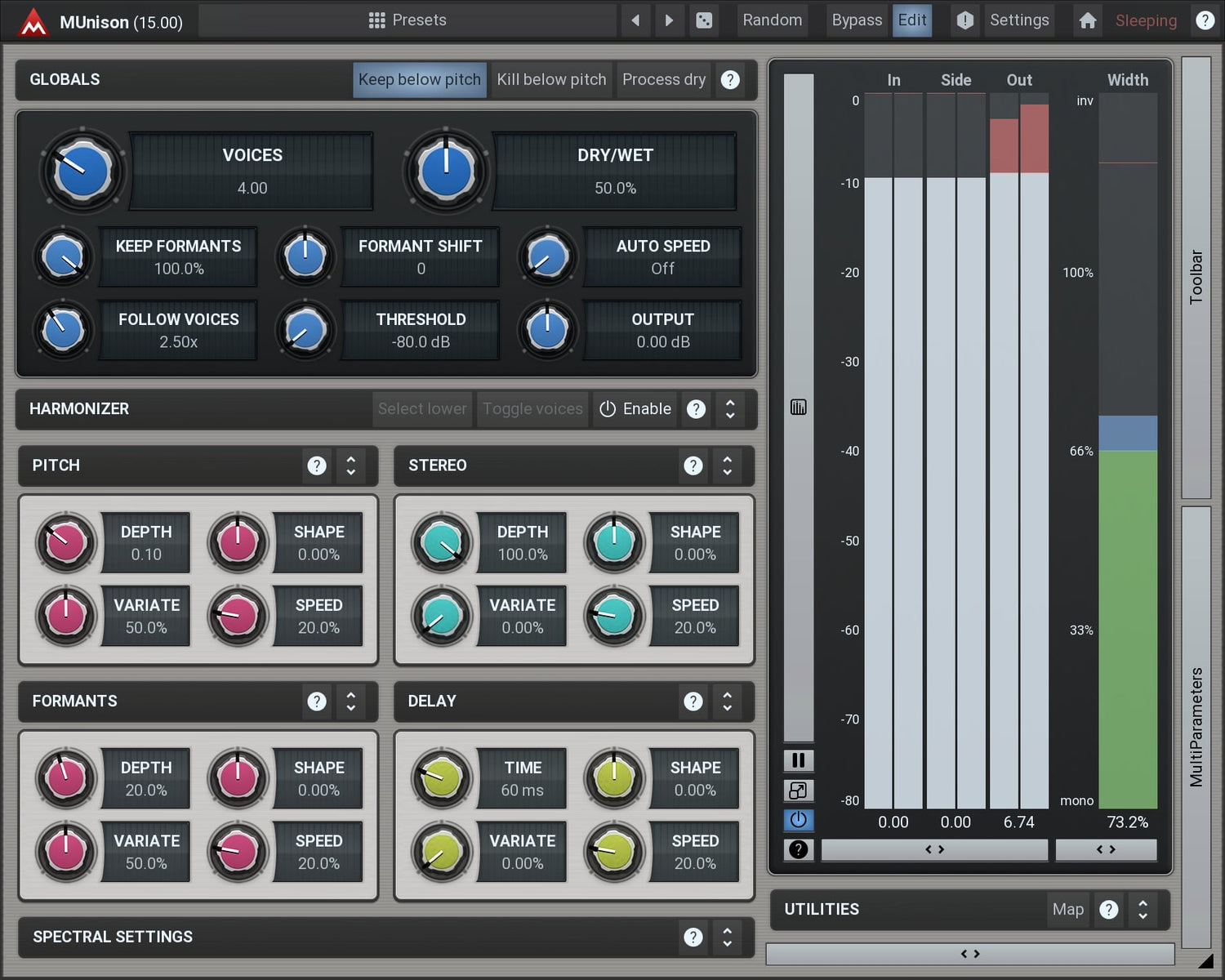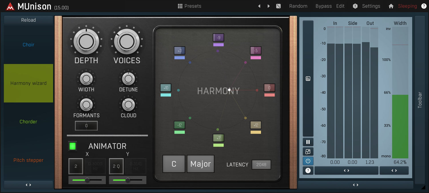 MUnison er en unik kombinasjon av doubler/unison og smart harmonizer. Den lar vokalene dine høres ut som et orkester med automatisk skalerte harmonier, produserer klassisk double-tracking-effekt og mye mer.