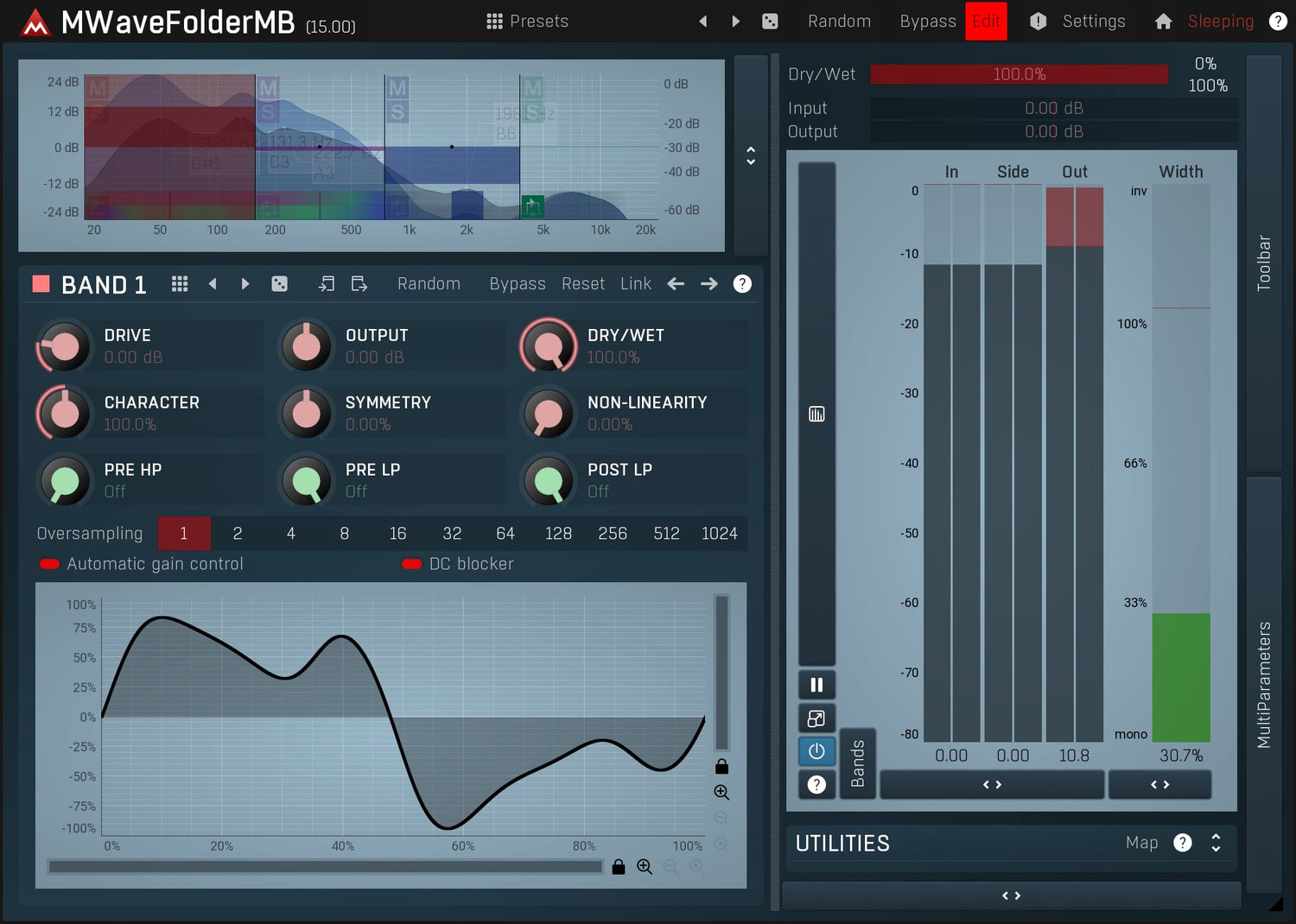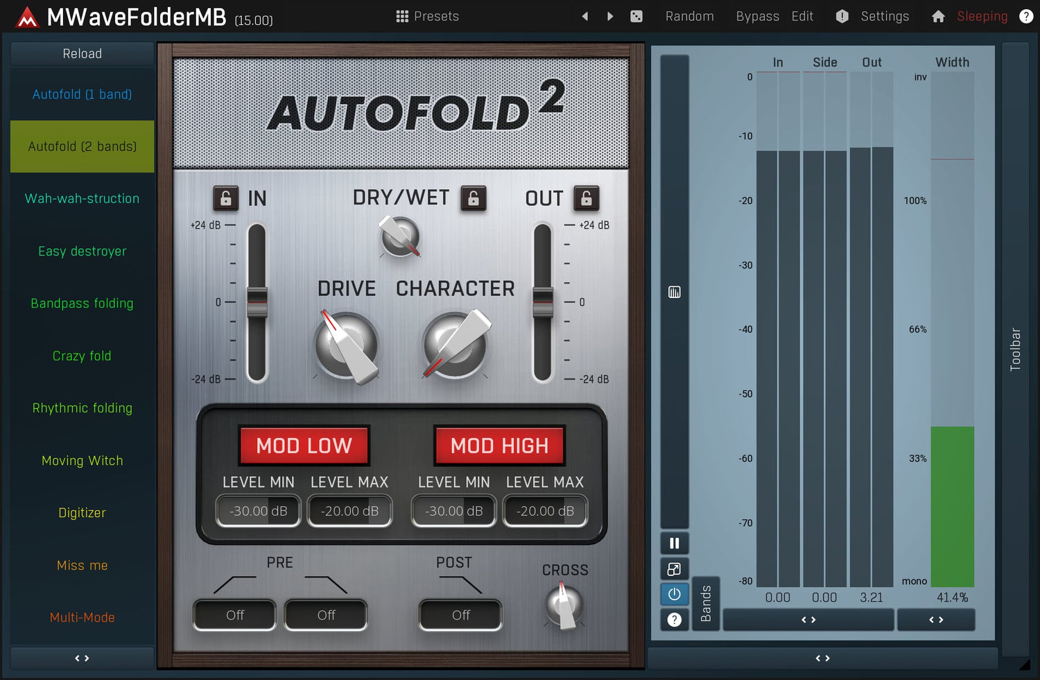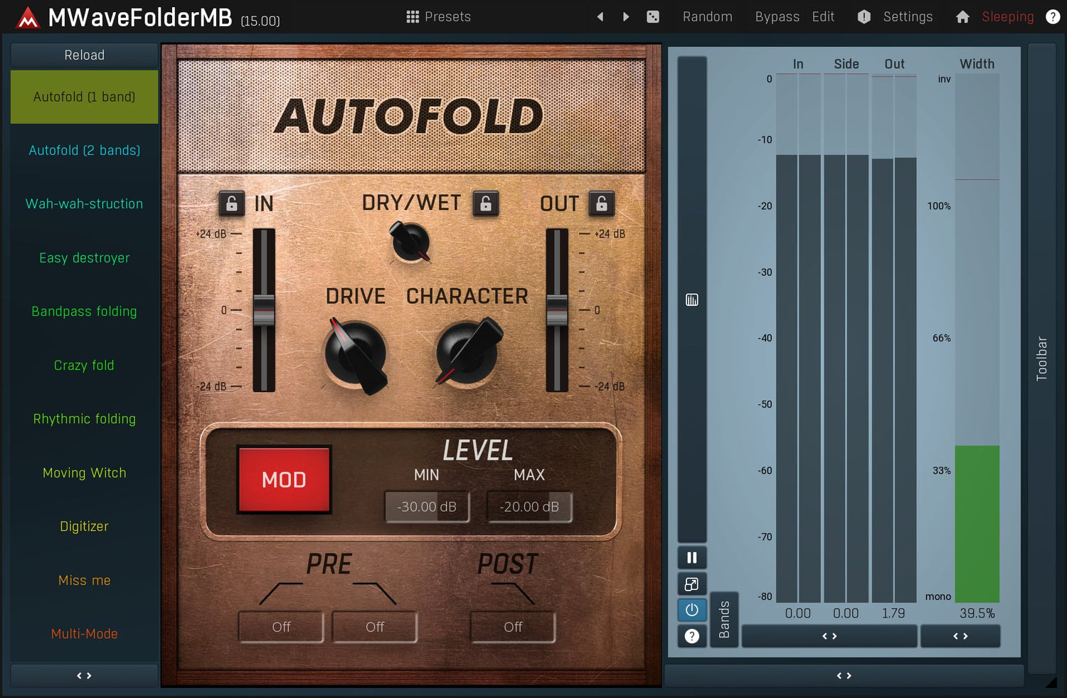 MMultiBandWaveFolder er et kraftig distorsjonsmodul, inspirert av analog teknologi, hevet til et helt nytt nivå ved hjelp av digital behandling. Den har en unik karakter som spenner fra mild harmonisk forbedring til fullstendig lydødeleggelse.