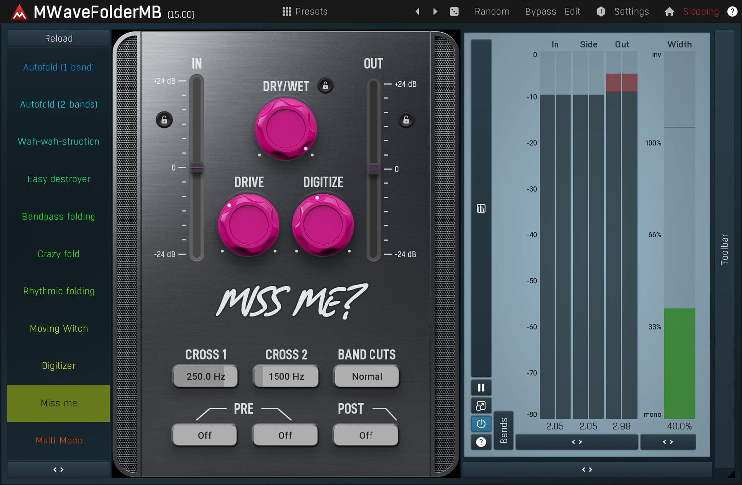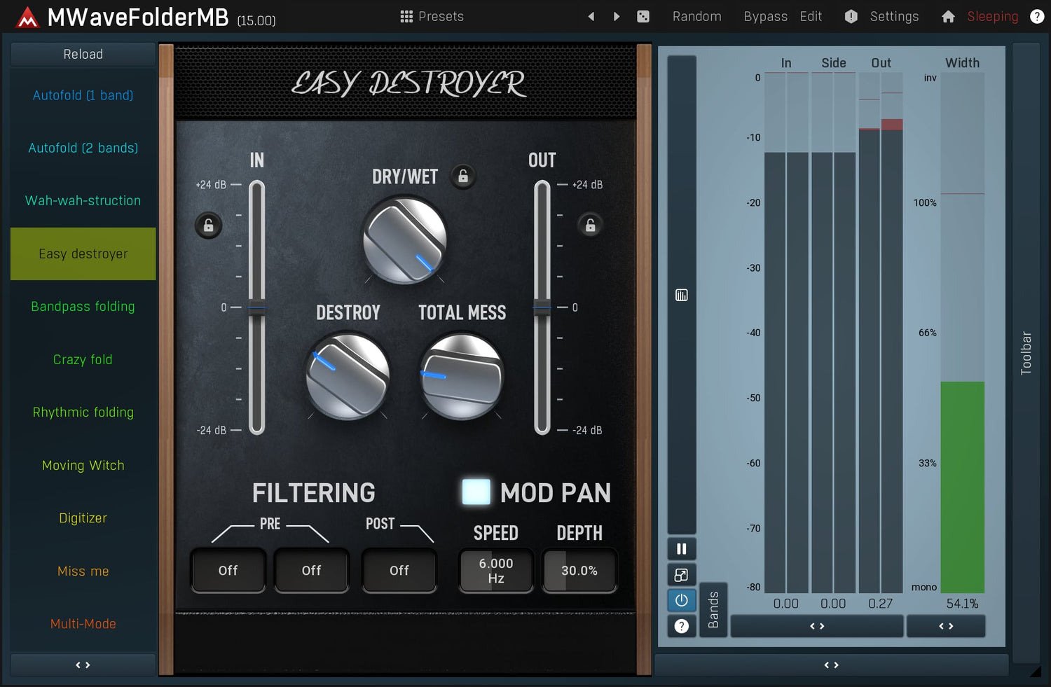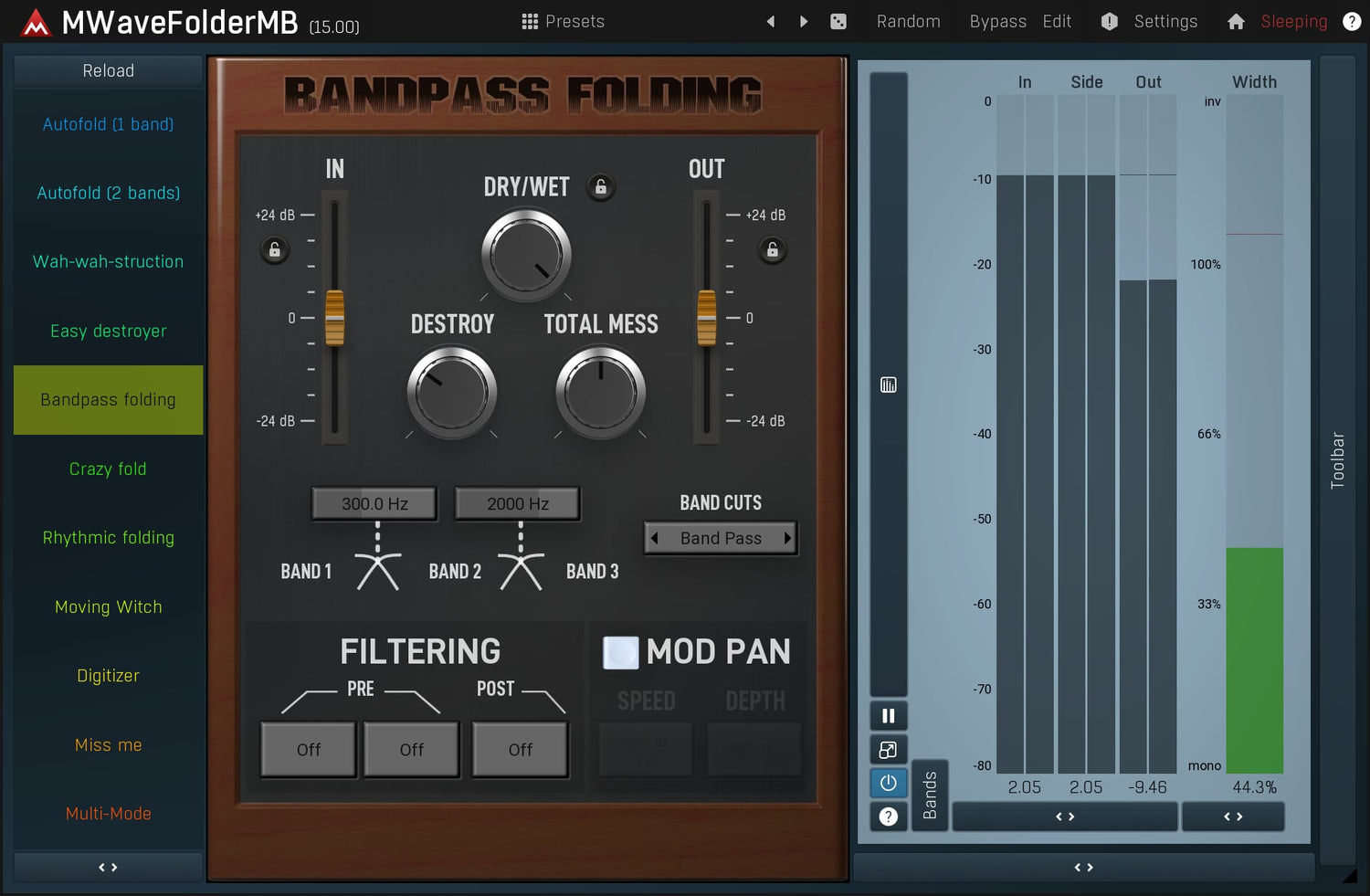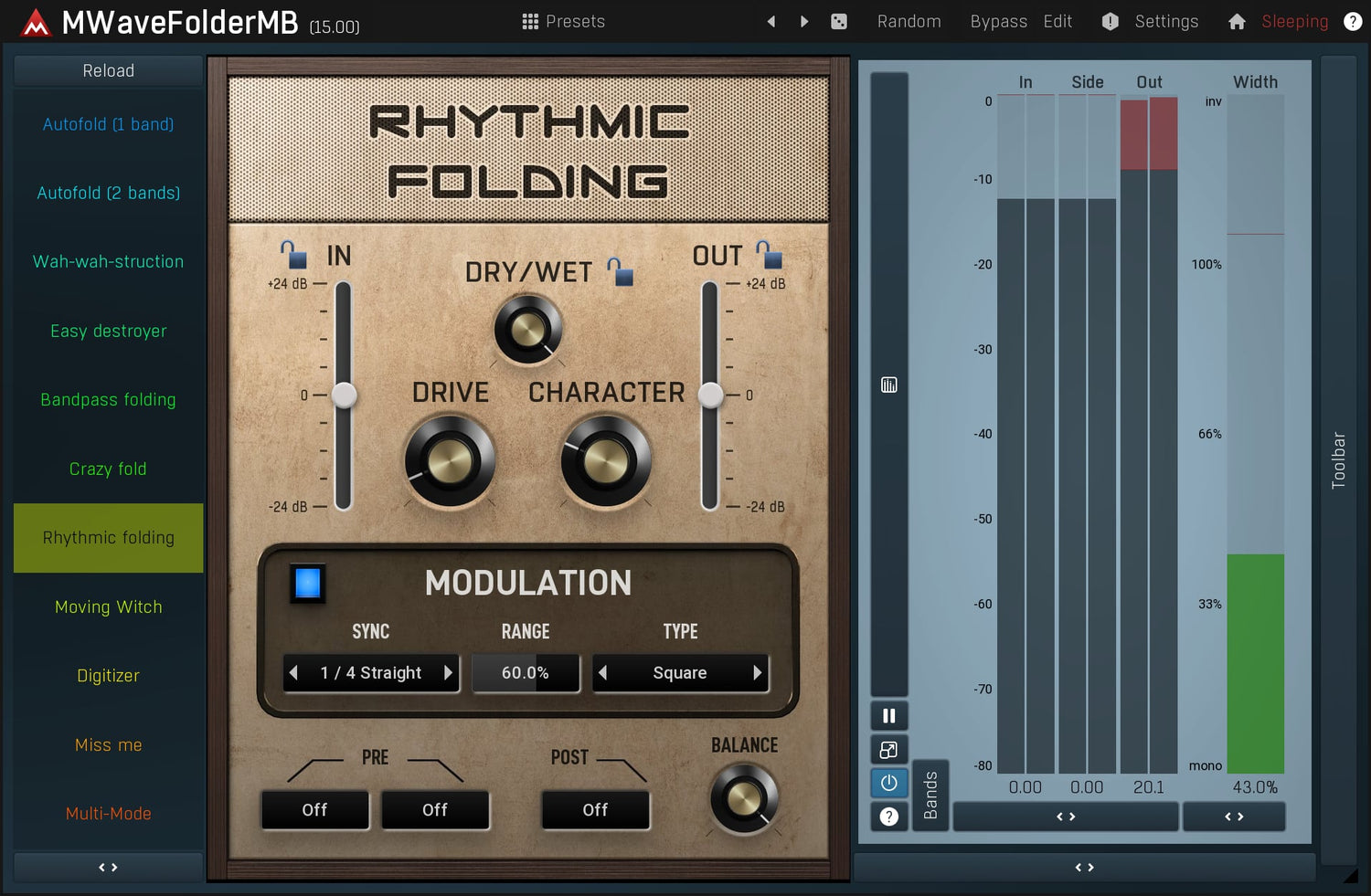 MMultiBandWaveFolder er et kraftig distorsjonsmodul, inspirert av analog teknologi, hevet til et helt nytt nivå ved hjelp av digital behandling. Den har en unik karakter som spenner fra mild harmonisk forbedring til fullstendig lydødeleggelse.