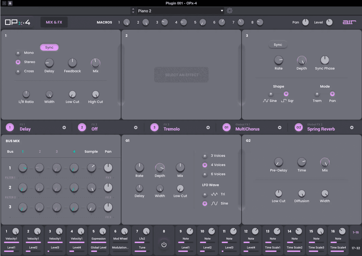 Med sin fleksible bølgeformatering, dual-mode filterbane med 23 forskjellige filtertyper, seks envelopes med tempo-synkronisert looping, to LFOer og to ramper, vil OPx-4 bli din go-to FM-synth. Den inkluderer tre insert FX og to globale FX for bruk med 27 inkluderte AIR effekt-plugins, som reverb, delay, distorsjon, modulasjonseffekter og mer.