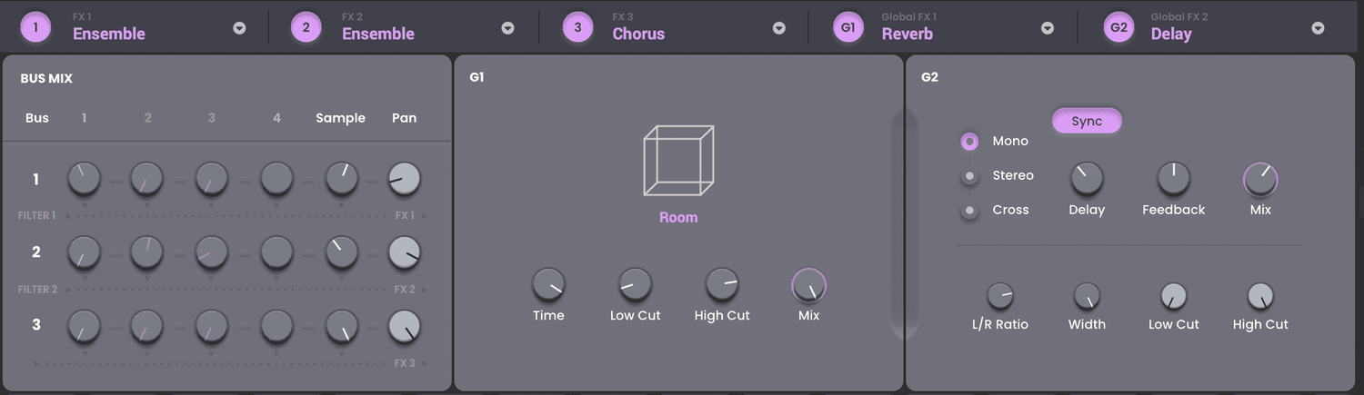 Ved å bruke fire FM-operatører og en FM-operatormatrise kan du lage nesten hvilken som helst FM-lyd du noen gang har hørt—eller til og med de du ikke har hørt om ennå! Du kan justere verdiene til hver operatør ved hjelp av spesifikke kontroller på skjermen for pulsbredden, formant, FM-filtrering og FM-formatering, samt spesifikke ADSR- og FM-oscillator envelope-kontroller.