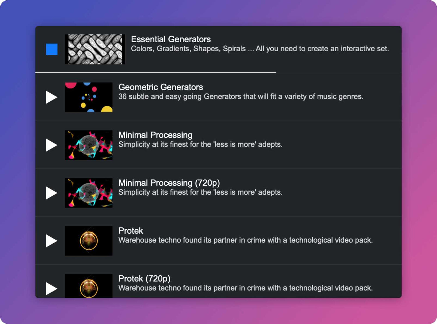 • 144 royalty-frie profesjonelle videoklipp (tilgjengelig i 404p, 720p & 1080p) • 36 royalty-frie profesjonelle lydklipp • Generatorer: inkluderer 48 sanntids genererte & lydreaktive glsl-filer • Overlays: inkluderer 13 videoklipp med transparent bakgrunn