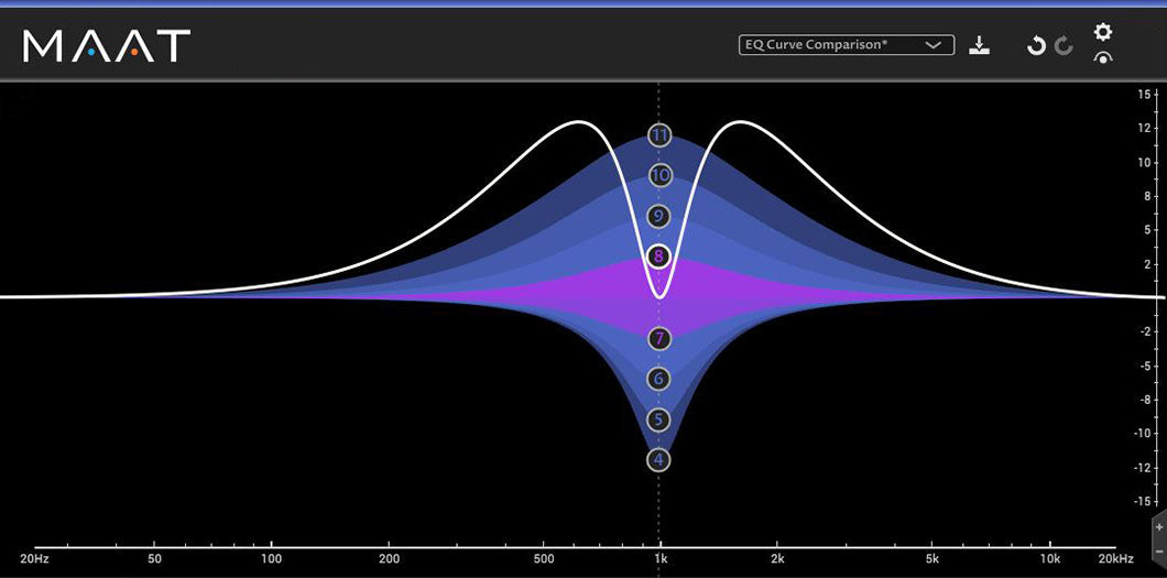 1. Alle 12 equalizer-arkitekturer er normalisert for å ha nøyaktig samme klokkeform for 6dB heving. Hvis du bruker bare ett klokke-filter ved +6dB, vil du få det samme hørbare resultatet for alle typer. Denne normaliseringen av Q eller Kvalitetsfaktor er en unik MAAT-funksjon, og skiller våre typologier fra deres analoge forgjengere fordi mange av de originale har udefinerte Q-definisjoner på grunn av begrensningen av analog teknologi. Normaliseringen lar deg sammenligne de forskjellige EQ-arkitekturene i SantaCruzEQ med letthet.