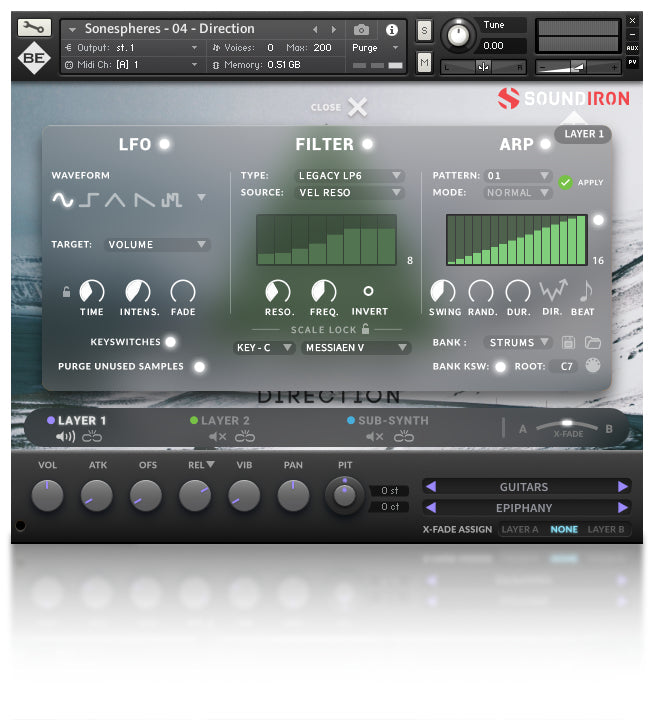 Denne biblioteket kommer med et tilpasningsdyktig LFO-system, med valgbar LFO-form, modulasjonsmålparameter, hastighet, intensitet, tempo-synkronisering og fade-in tid. Du kan også bruke ditt valg av 12 lavpass-, høypass- og FX-filtre, med tildelbare modulasjonsmål som hastighet, modhjul, uttrykk, after-touch, tangentinformasjon og step-sequencer tabellkontroll. Vår tilpassbare arpeggiator tilbyr en hastighetstabell og kontroll over arp-retning, timing, swing, randomisering og varighet. Vi har inkludert et nøkkel- og skala-lås-system for å begrense notene dine til vanlige skalaer og toner for enkel melodisk komposisjon og live-opptreden.
