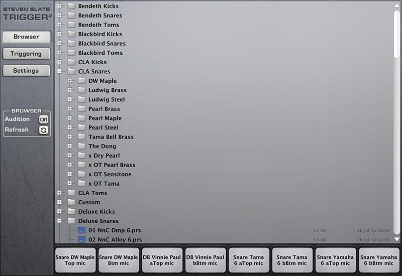 TRIGGER kommer med et bibliotek av bransjestandard trommesamples laget av Steven Slate. Elite miksere som Chris Lord Alge, Ross Hogarth, Justin Neibank, Dave Way, Jeff Juliano, Jay Baumgardner, Ben Grosse, David Kahn, Ryan Williams, og mange flere toppnavn har i årevis vært avhengige av Slates samples for å hjelpe til med å forbedre trommelydene i mikserne sine. Alle samples i Trigger er spilt inn på 2 tommers bånd og behandlet med det beste av vintage og moderne analog utstyr. TRIGGER kan også laste utvidelsesbiblioteker som Steven Slate Deluxe, Chris Lord Alge, Terry Date, Blackbird studios, og David Bendeth.