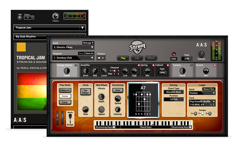 Applied Acoustics Systems slipper Tropical Jam lydpakken for Strum GS-2 og AAS Player plug-ins i samarbeid med resident lyddesigner Niall McCallum.