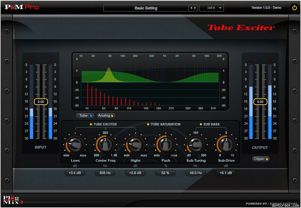 Plug-in-modulen har Tube Exciter, Tube Saturation og Sub Bass-forsterkere som kan berike lyden din på subtile og drastiske måter.