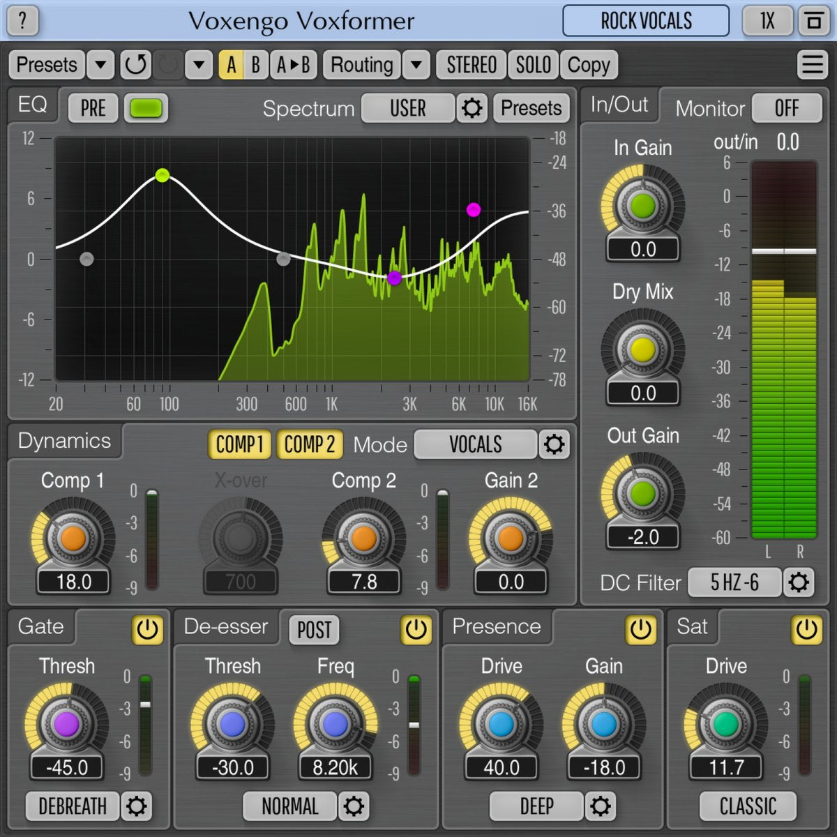Som en avsluttende touch tilbyr Voxformer deg en fleksibel og brukervennlig 5-bånds parametrisk equalizer (pre/post valgbar) med en sanntids utgangsstadium hurtig Fourier-transformasjon (FFT) spektrumanalysatorvisning. I de fleste tilfeller kan Voxformer brukes til behandling av et bredt spekter av instrumenter i tillegg til vokaler.