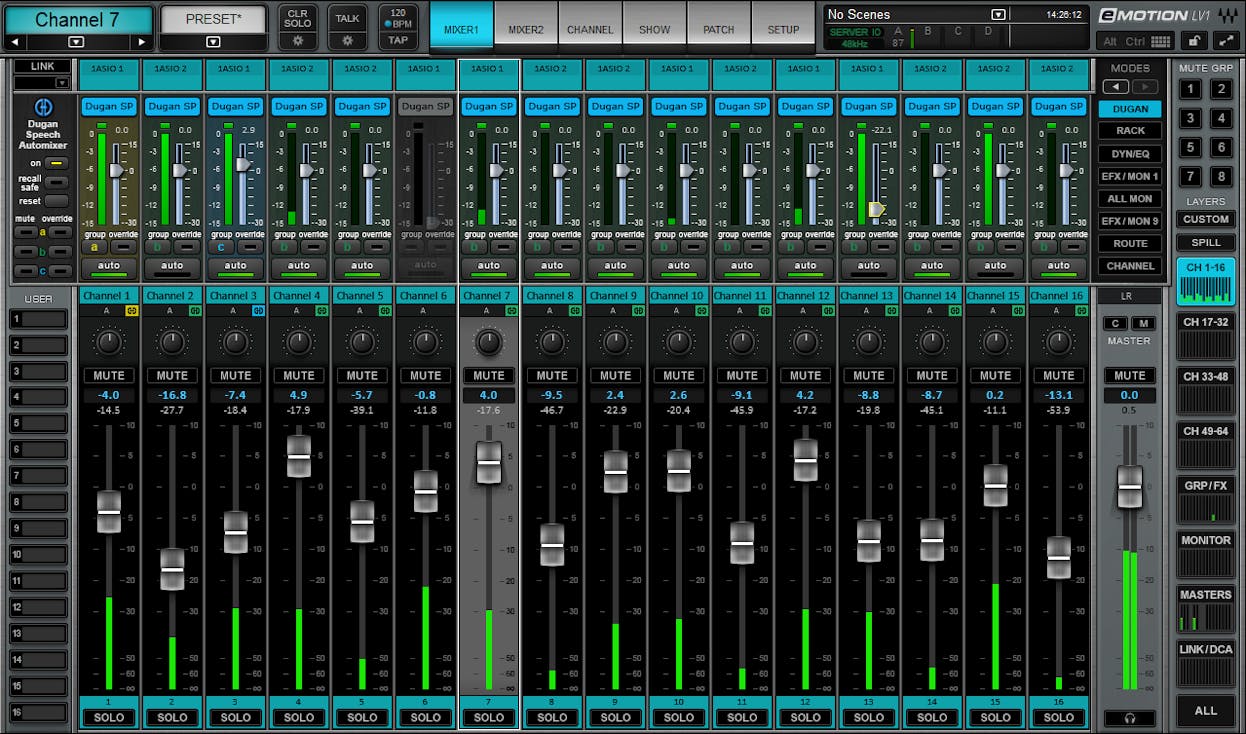 Dette er hvor Dugan Speech auto-mixer kommer inn. Utviklet sammen med lydoppfinner Dan Dugan, kontrollerer Dugan Speech forsterkningen automatisk, i sanntid. Glem marerittene med å kontrollere flere mikrofoner—nå kan du kjøre opptil 64 mikrofoner med full tillit.