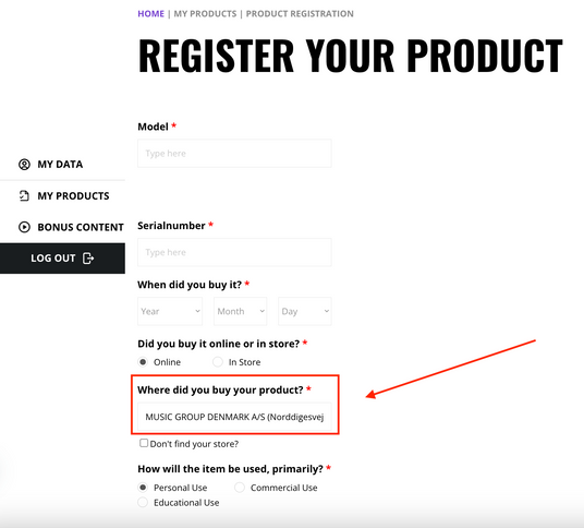 Deretter må du registrere kjøpet ditt, det vil si at du skal oppgi hvilken modell du har kjøpt, samt serienummeret (serienummeret finnes ofte på baksiden av enheten din, ofte markert S/N:), når du kjøpte den og hvor.