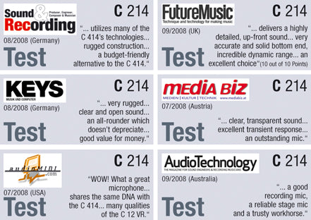 - C214 fanger opp lyd ved å kombinere en kapsel av det legendariske C414 dual-capsule-systemet og den patenterte AKG Back-Plate Technology, noe som resulterer i en enestående ytelse nær den berømte C414 XLII.