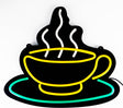 Flott neonskilt med en dampende kaffekopp!