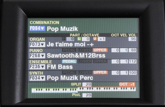 - Komplett pianoløsning med omfattende patch og combination hukommelsesmuligheter.